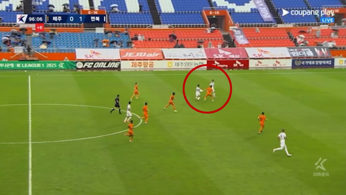 전북의 후방 프리킥이 페널티 박스 안 포스트 플레이에 이어 수비 뒷공간을 파고들던 전진우에게 연결됐다. 전진우는 절묘한 페인팅으로 수비 한 명을 제친 뒤, 볼을 컨트롤하는 과정에서 제주 수비수 장민규에게 걸려 넘어졌다. 전진우는 발목을 부여잡고 한참 고통을 호소했다. 파울이 선언됐다면 전북에 페널티킥이 주어지는 상황. 그러나 이동준 주심의 휘슬은 불리지 않았다. 오히려 경기는 계속 진행됐고, 이후 판정에 항의하던 거스 포옛 감독이 경고를 받았다.