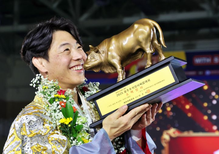 이완수가 4일 울산광역시 울주군 울주종합체육관에서 열린 '위더스제약 2025 울주추석장사씨름대회 소백장사(72㎏ 이하)' 결정전에서 우승한 뒤 트로피를 들고 환하게 웃고 있다. /사진=대한씨름협회 제공