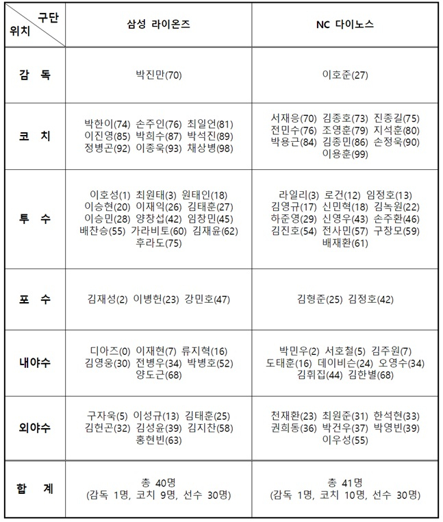 외야수도 똑같이 7명을 데려가는 가운데, 삼성은 포수 3명-내야수 7명, NC는 포수 2명-내야수 8명으로 간다. 삼성은 박병호와 전병우 등 펀치력이 있는 내야수들이 뒤에서 대기할 전망이고, NC는 허리 통증으로 선발 출전이 어려운 박민우 대신 다른 내야수들이 빈자리를 채울 것으로 보인다.