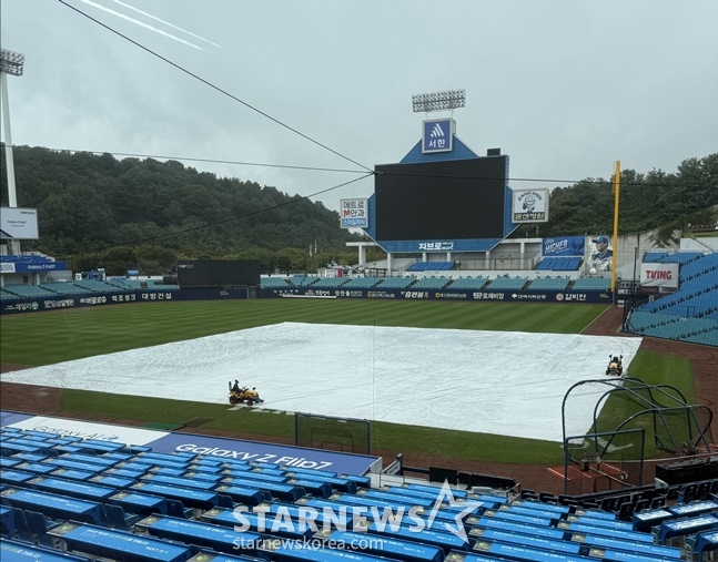 가을야구 시작부터 치열한 대결이 예상되지만, 변수가 생겼으니 바로 '비'다. 이날 대구 지역에는 오전부터 비가 내리고 있는 상황이다. 일부 흙바닥에는 물웅덩이도 고였다. 이에 경기장에도 대형 방수포가 깔리면서 대비를 하고 있다. 기상청 예보상으로는 오후 12시 이후로는 비 예보가 없기는 하나, 경기장 정비 시간을 감안하면 지연 개시 가능성도 있다.