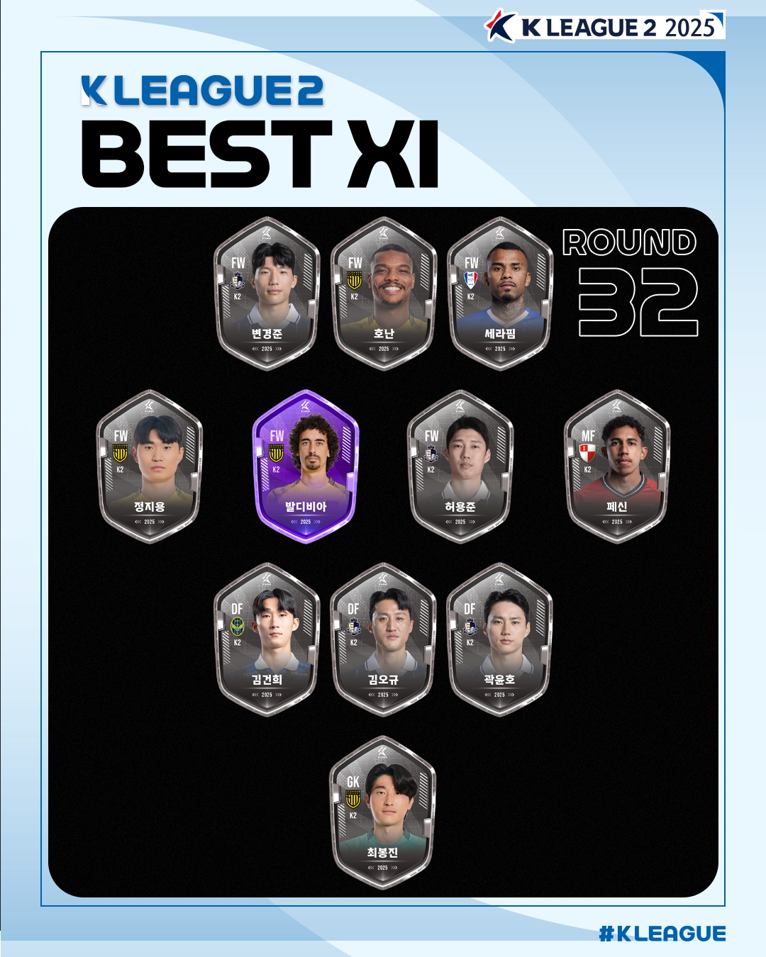 '하나은행 K리그2 2025' 32라운드 MVP는 전남 드래곤즈의 발디비아가 선정됐다. 발디비아는 5일 광양축구전용구장에서 열린 천안 시티FC전에서 1골 2도움을 기록하며 전남의 4-1 승리를 이끌었다. 전남은 발디비아 외에도 호난, 정지용, 최봉진이 베스트11에 이름을 올리며 K리그2 32라운드 베스트 팀으로 선정됐다.