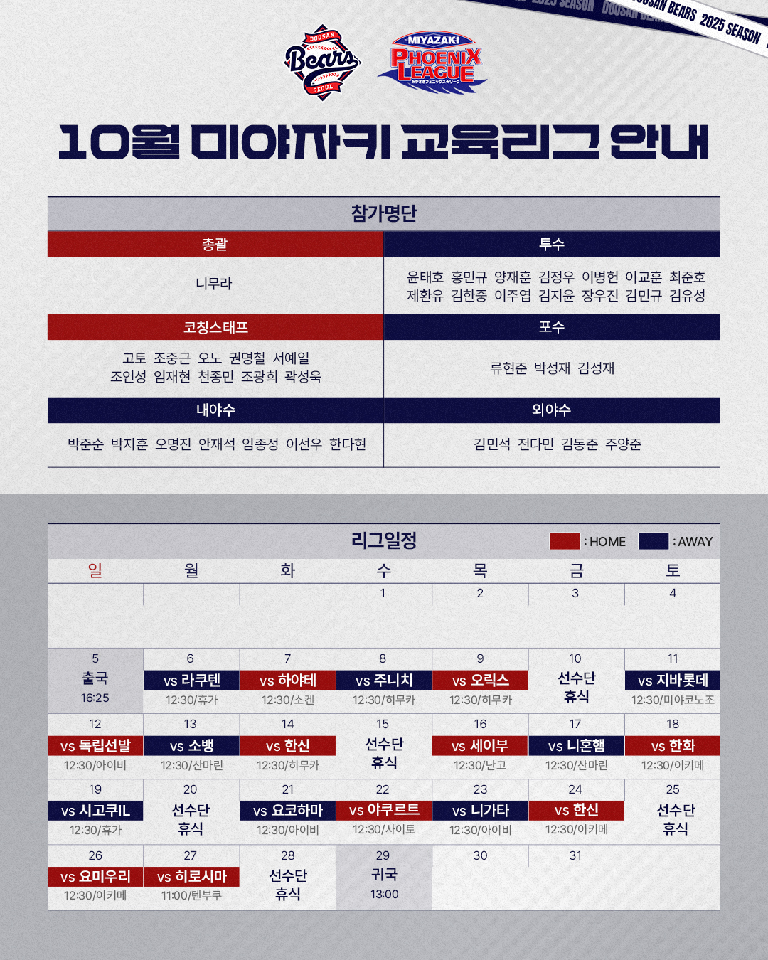 한편 니무라 퓨처스팀 총괄 코치가 이끄는 두산 선수단은 코칭스태프 11명, 선수 28명으로 구성했다.