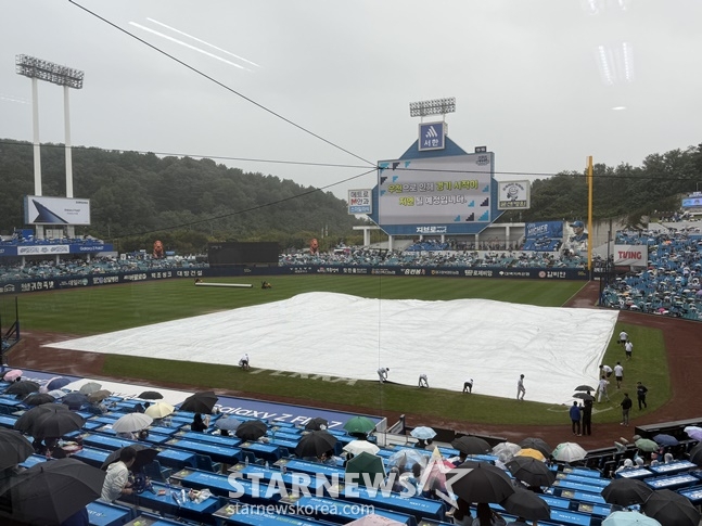 경기 종료 후에도 내리던 비는 7일 오전에 잠시 그쳤다. 하지만 경기 시작이 다가오면서 점점 빗줄기가 굵어졌고, 시작 직전에는 더 많은 비가 내렸다. 결국 경기 개시 10분을 남겨놓고 대형 방수포가 깔렸고, 전광판을 통해 지연 개시 공지가 표출됐다.
