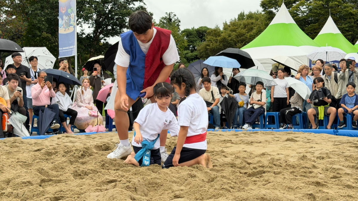올해로 3회째를 맞은 이번 행사는 명절의 세시 풍속을 되새기고 가족 단위 관람객들이 전통 스포츠 씨름을 체험하며 풍성한 추석의 정취를 함께 나누기 위해 마련됐다. 비가 내리는 궂은 날씨에도 현장은 시민들의 뜨거운 호응으로 활기를 띠었다.