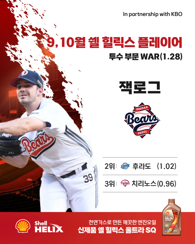 한국야구위원회(KBO)는 8일 "한국쉘석유주식회사(한국쉘)와 함께 시상하는 '쉘힐릭스플레이어'의 2025 신한 SOL뱅크 KBO 리그 9-10월 수상자로 잭 로그(두산 베어스)와 오스틴 딘(LG 트윈스)이 선정됐다"고 공식 발표했다.