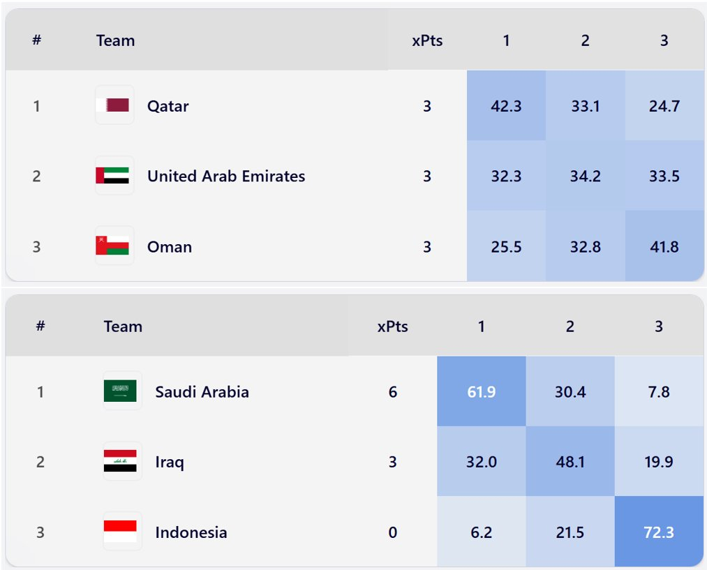 데이터 업체 풋볼 미츠 데이터는 A조 1위 확률을 카타르 42.3%, UAE 32.3%, 오만 25.5%로 사실상 치열한 경쟁이 펼쳐질 것으로 봤다. B조는 사우디가 61.9%로 가장 높았고, 이라크가 32%, 인도네시아는 6.2% 순이었다.
