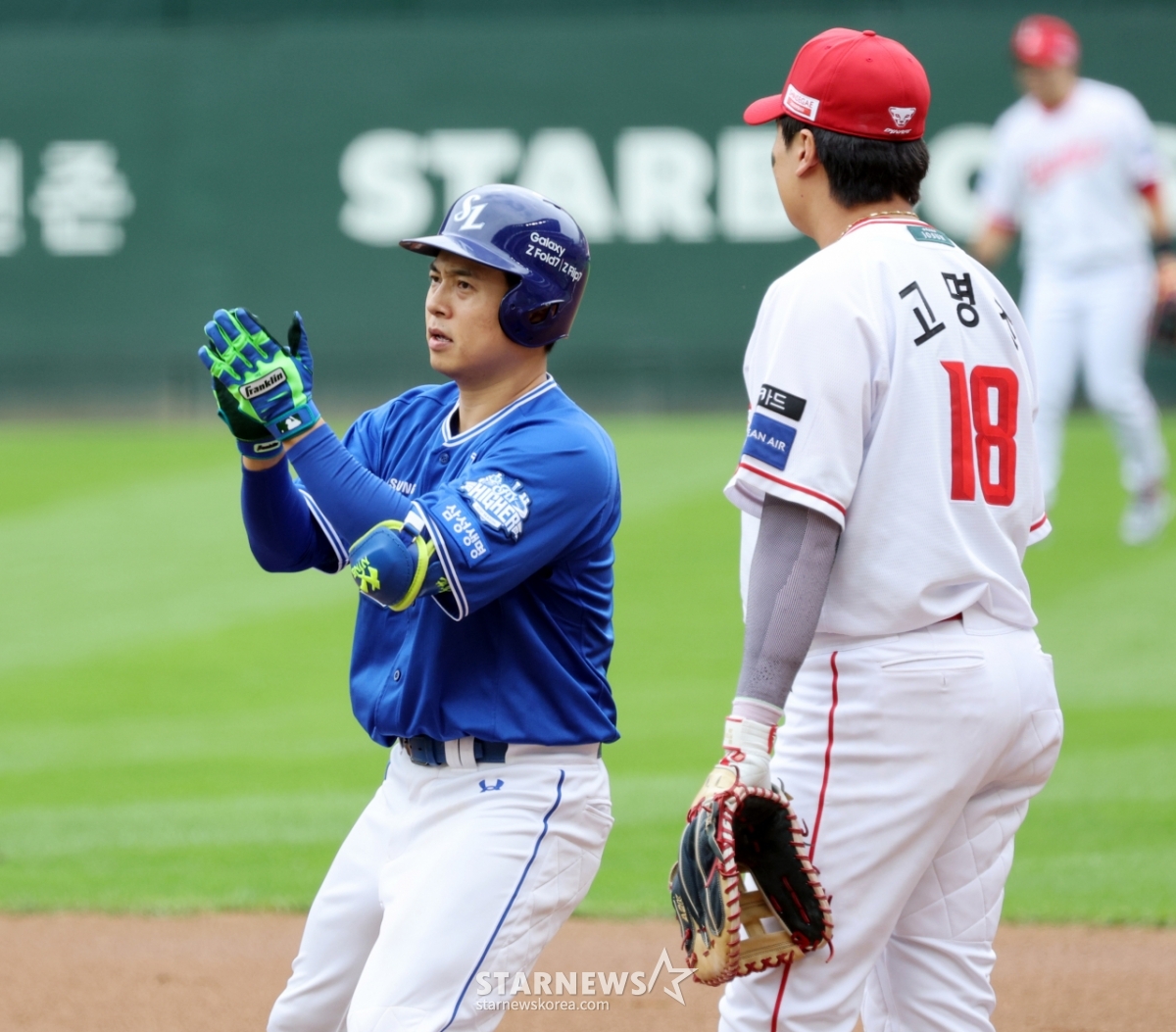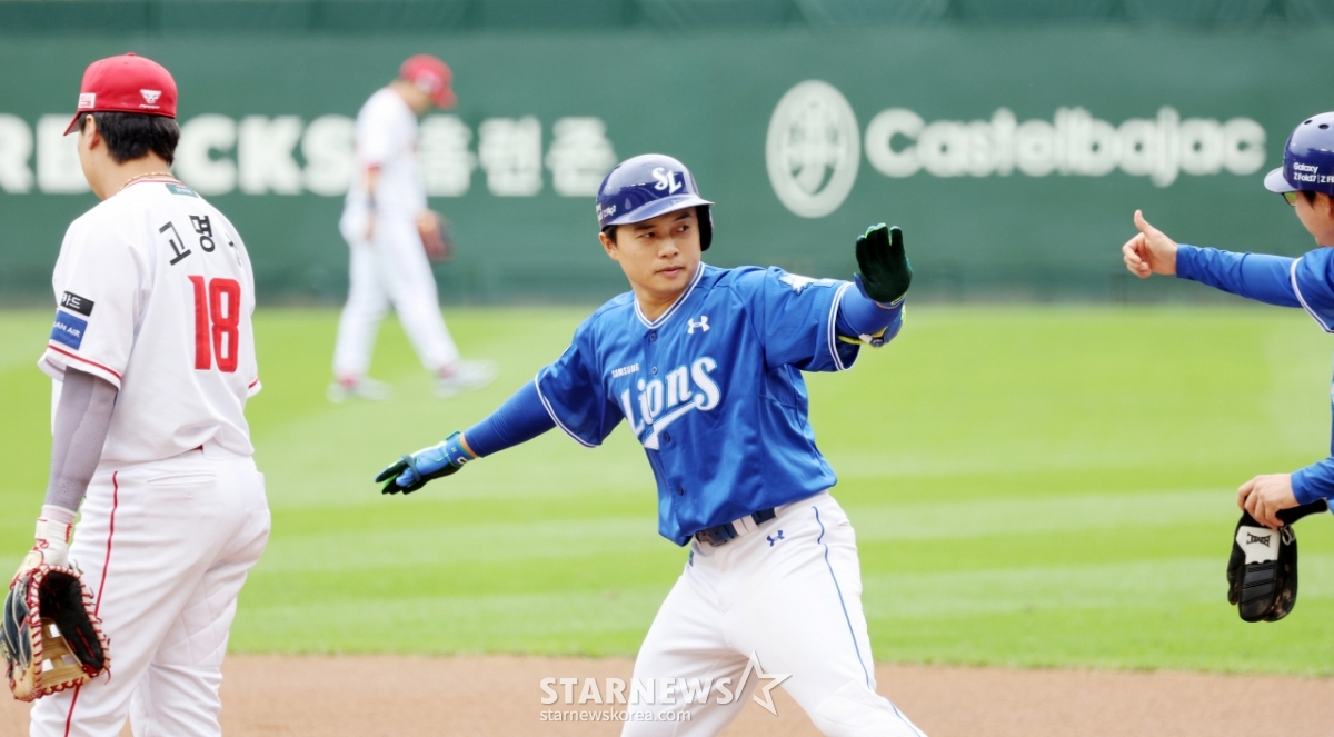 삼성 8번타자 김헌곤이 9일 인천SSG랜더스필드에서 열린 2025 KBO리그 준플레이오프 1차전 SSG랜더스와 삼성라이온즈 경기 2회초 무사 1루에서 안타로 출루하고 있다. 2025.10.09