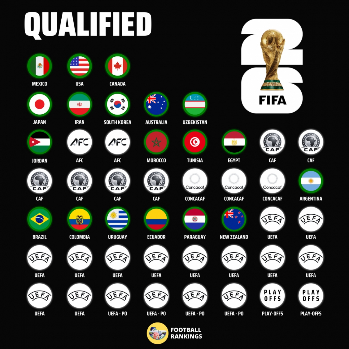 멕시코와 미국, 캐나다 등 개최국 3개국을 비롯해 아시아에서는 대한민국과 일본·이란·호주·요르단·우즈베키스탄이 본선 진출을 확정했다. 아프리카에서는 모로코·튀니지·이집트가, 남미에서는 아르헨티나·브라질·에콰도르·우루과이·콜롬비아·파라과이, 오세아니아에서는 뉴질랜드가 각각 월드컵 본선행을 확정한 상태다.