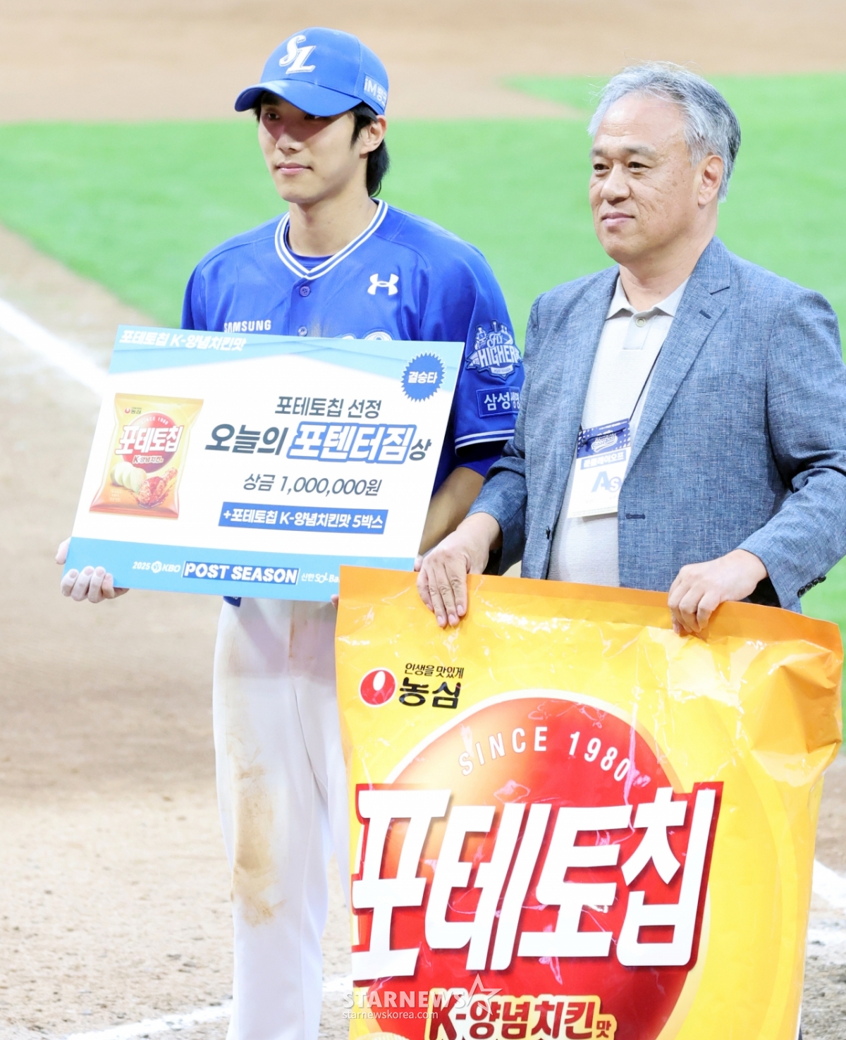 화이트를 상대로 1회초 선제 선두타자홈런을 기록한 이재현이 인천SSG랜더스필드에서 열린 2025 KBO리그 준플레이오프 1차전 SSG랜더스와 삼성라이온즈 경기에서 승리한 후 '오늘의 포텐터짐상을 수상하고 있다. 2025.10.09.
