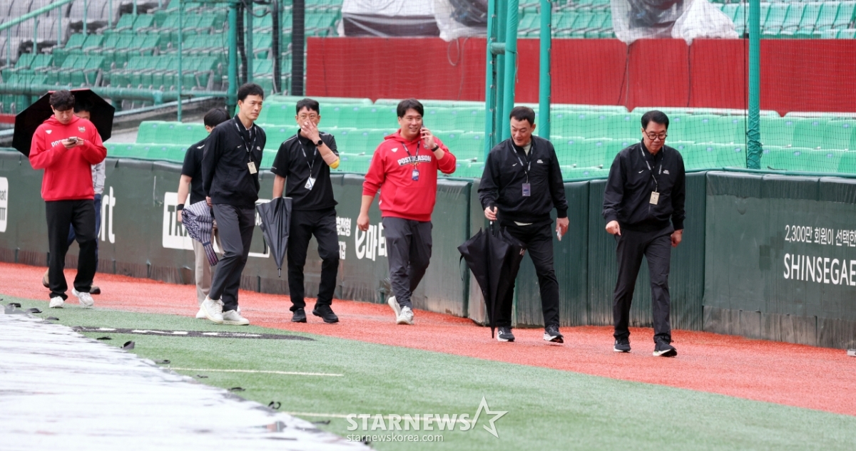 스포츠야구[포토]그라운드 살피는 김병주 심판위원장과 김시진 경기감독관발행 : 2025.10.10 ・ 15:49인천=강영조 선임기자광고삭제2025 KBO리그 준플레이오프 2차전 SSG랜더스와 삼성라이온즈 경기가 열릴 예정인 인천SSG랜더스필드. 방수포가 내야를 덮은 가운데 가을비가 오후에도 계속해서 내리고 있다. 김병주 심판위원장과 김시진 경기감독관이 일찌감치 외야를 비롯해 그라운드 사정을 살피고 있다. 2025.10.10.<저작권자 © 스타뉴스, 무단전재 및 재배포 금지>김병주김시진랜더스경기그라운드심판추천 기사강영조 선임기자기자홈좋아요 스포츠-야구의 인기 급상승 뉴스스포츠-야구의 최신 뉴스