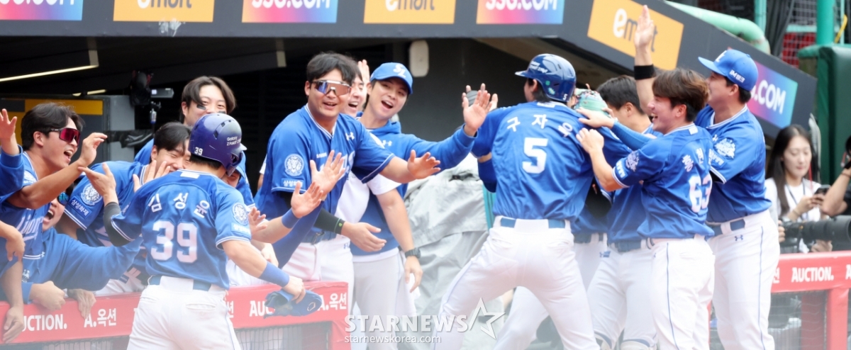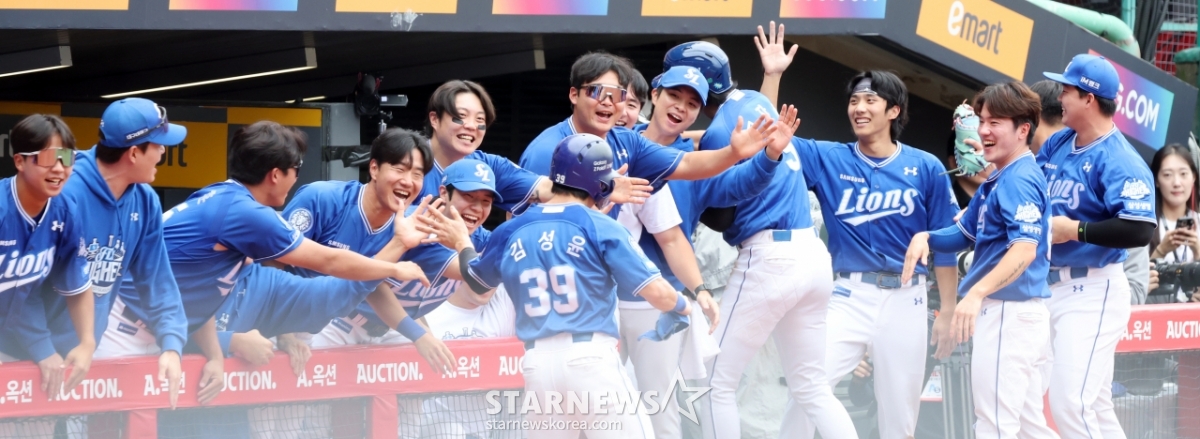 삼성 4번타자 디아즈가 11일 인천SSG랜더스필드에서 열리는 2025 KBO리그 준플레이오프 2차전 SSG랜더스와 삼성라이온즈 경기 4회초 1사 2,3루에서 김건우를 상대로 2타점 적시타를 터트렸다. 득점주자 구자욱과 김성윤이 더그아웃 동료들과 자축하고 있다. 2025.10.11.