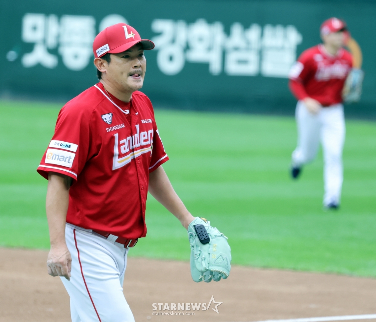 SSG 베테랑 불펜 노경은이 11일 인천SSG랜더스필드에서 열리는 2025 KBO리그 준플레이오프 2차전 SSG랜더스와 삼성라이온즈 경기 5회 2사 만루위기에서 구자욱을 땅볼처리하며 막아내고 있다. 2025.10.11.