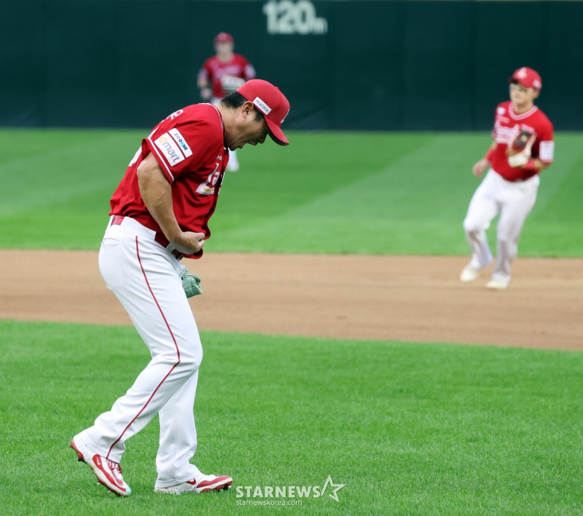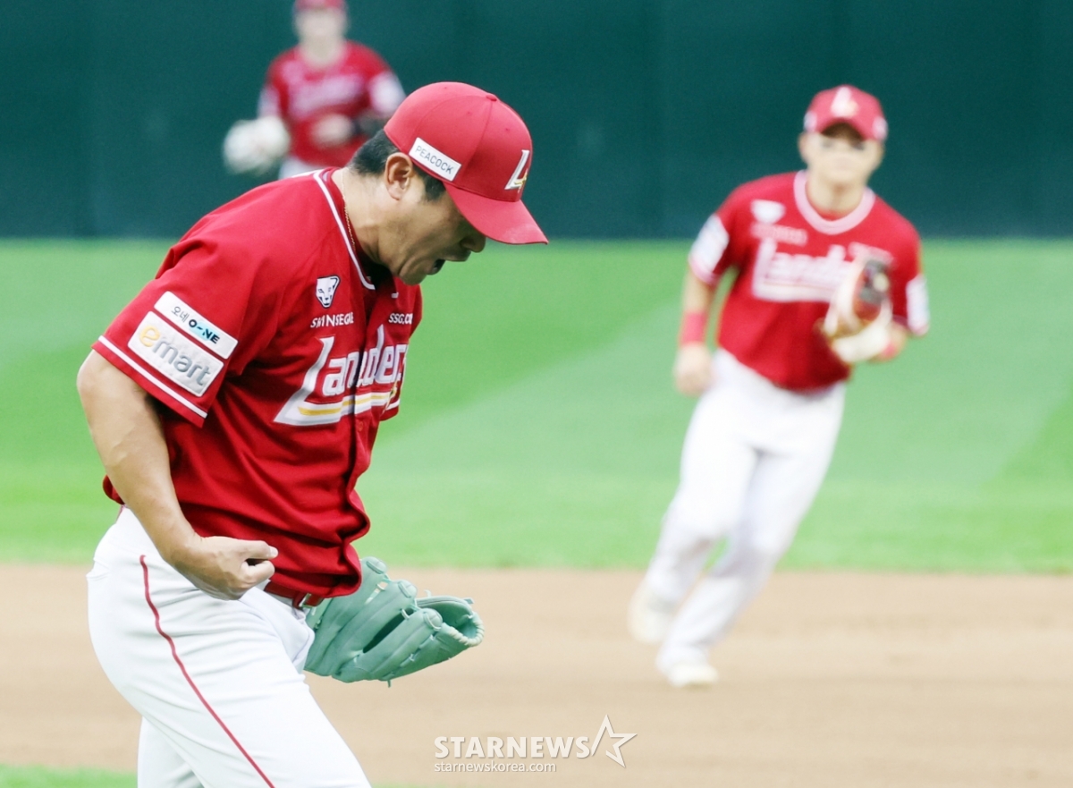 랜더스 베테랑 홀드왕 노경은이 11일 인천SSG랜더스필드에서 열리는 2025 KBO리그 준플레이오프 2차전 SSG랜더스와 삼성라이온즈 경기 7회초 안타를 하나 허용했지만 무실점으로 1점 리드를 지킨후 환호하고 있다. 2와 1/3이닝 무실점으로 리드를 지켜내고 있는 노경은. 2025.10.11.