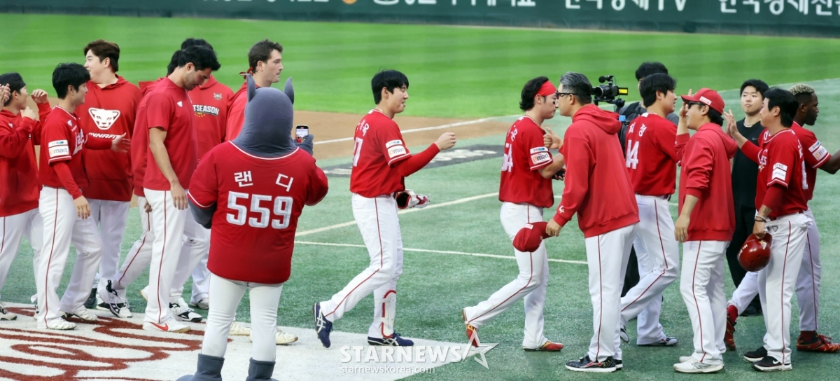 랜더스 7번타자 김성욱이 11일 인천SSG랜더스필드에서 열리는 2025 KBO리그 준플레이오프 2차전 SSG랜더스와 삼성라이온즈 경기 9회말 1사 후 후라도를 상대로 끝내기 좌월홈런을 터트리며 동료들의 격한 축하를 받고 있다. 이숭용 감독이 모자를 벗어 인사하고 있다. 2025.10.11.