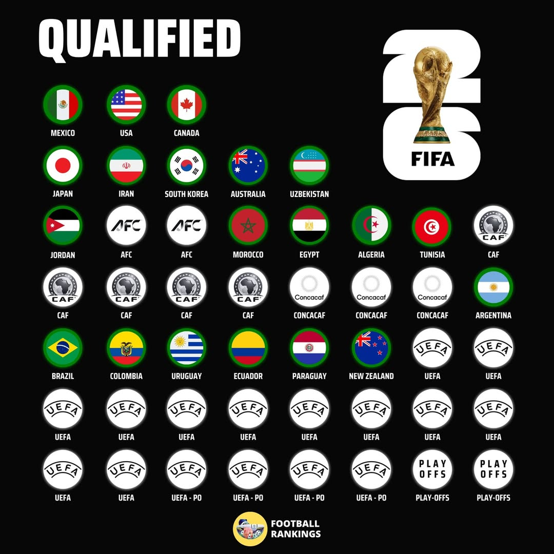 총 48개국이 출전하는 북중미 월드컵 본선 진출 확정팀은 개최국 멕시코와 미국·캐나다를 비롯해 대한민국·일본·이란·호주·요르단·우즈베키스탄(이상 아시아), 모로코·튀니지·이집트·알제리(이상 아프리카), 아르헨티나·브라질·에콰도르·우루과이·콜롬비아·파라과이(이상 남미), 뉴질랜드(오세아니아) 등 20개 팀으로 늘었다. 남은 본선 진출권은 아시아 2장, 아프리카 5장, 북중미 3장, 유럽 16장, 대륙간 플레이오프 2장 등 28장이다.