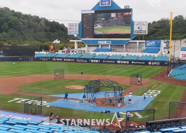 여전히 대구 하늘은 흐린 상황이지만 경기 정상 진행에는 문제가 없을 것으로 보인다. 이미 방수포를 걷었고 삼성 선수들이 그라운드로 나와 훈련에 나서고 있다.