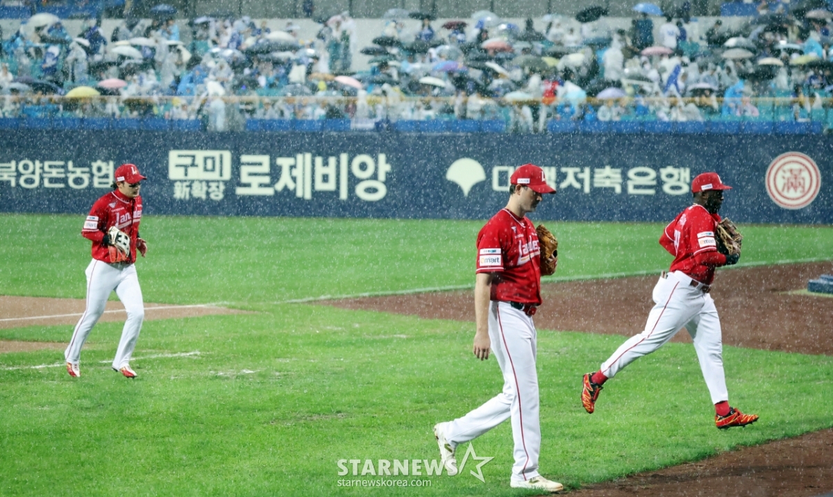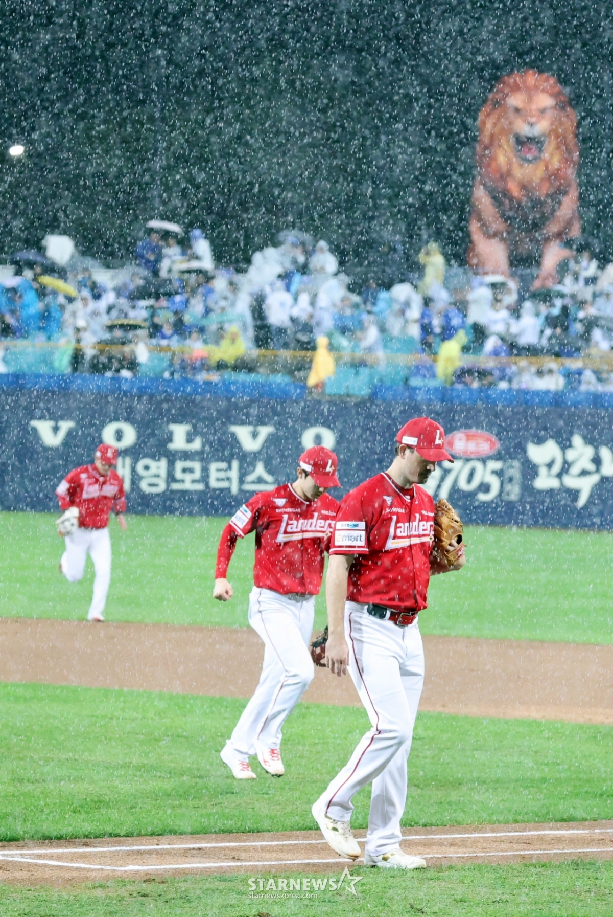 SSG 선발투수 앤더슨이 13일 대구삼성라이온즈파크에서 열리는 2025 KBO리그 준플레이오프 3차전 SSG랜더스와 삼성라이온즈 경기 1회말 등판해 투구를 시작하려는 순간 폭우가 쏟아져 더그아웃으로 철수하고 있다. 2025.10.11.