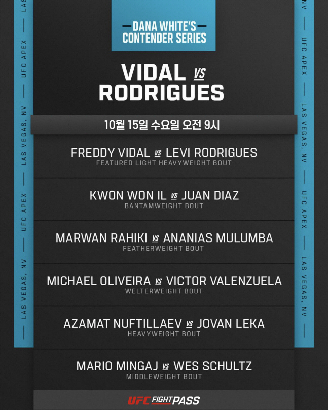 권원일이 출전하는 데이나 화이트의 컨텐더 시리즈(DWCS) 시즌 9 에피소드 10는 오는 10월 15일(수) 오전 9시부터 UFC 파이트패스에서 생중계된다.