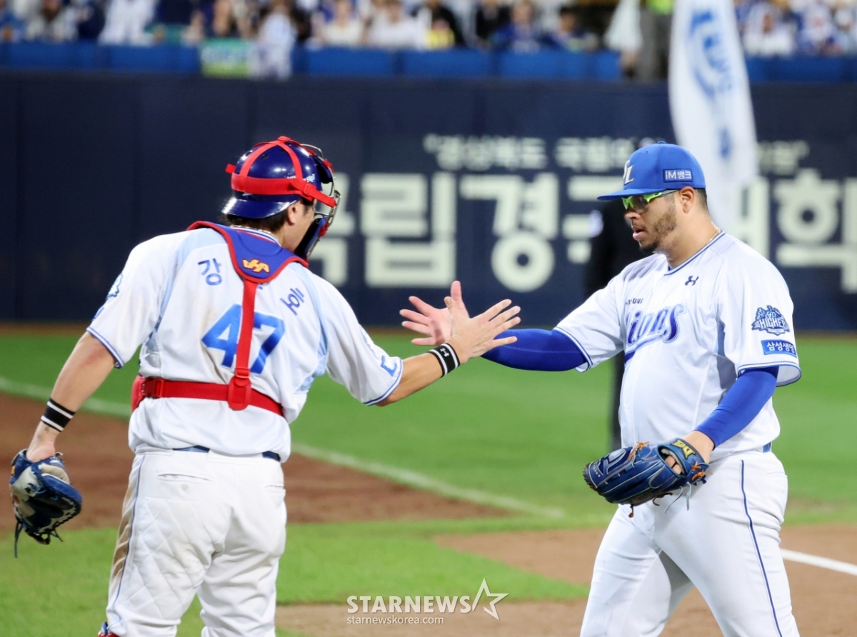 스포츠야구[포토] 7이닝 무실점 호투 후라도 '강민호와 자축발행 : 2025.10.14 ・ 20:45대구=강영조 선임기자광고삭제삼성 우완투수 후라도가 14일 대구삼성라이온즈파크에서 열리는 2025 KBO리그 준플레이오프 4차전 SSG랜더스와 삼성라이온즈 경기 7회초 2사 1루 김성욱을 유격수앞땅볼로 처리하며 환호하고 있다. 김성욱은 2차전 후라도를 상대로 끝내기홈런을 터트렸었다. 강민호와 자축하는 후라도. 2025.10.14.<저작권자 © 스타뉴스, 무단전재 및 재배포 금지>강민호삼성라이온즈김성욱자축후라도추천 기사강영조 선임기자기자홈좋아요 스포츠-야구의 인기 급상승 뉴스스포츠-야구의 최신 뉴스