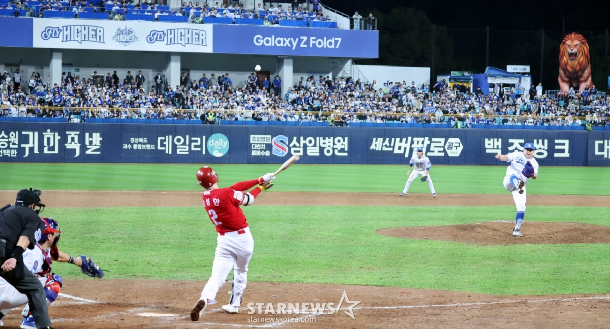 스포츠야구[포토] 좌중간 2타점 동점2루타, 박성한발행 : 2025.10.14 ・ 21:01대구=강영조 선임기자광고삭제SSG 1번타자 박성한이 14일 대구삼성라이온즈파크에서 열리는 2025 KBO리그 준플레이오프 4차전 SSG랜더스와 삼성라이온즈 경기 8회초 무사 1,3루에서 2타점 동점2루타를 터트리고 있다. 볼 홈으로 중계되는 사이 3루에 안착한 박성한. 2025.10.14.<저작권자 © 스타뉴스, 무단전재 및 재배포 금지>박성한삼성라이온즈타점동점루타추천 기사강영조 선임기자기자홈좋아요 스포츠-야구의 인기 급상승 뉴스스포츠-야구의 최신 뉴스
