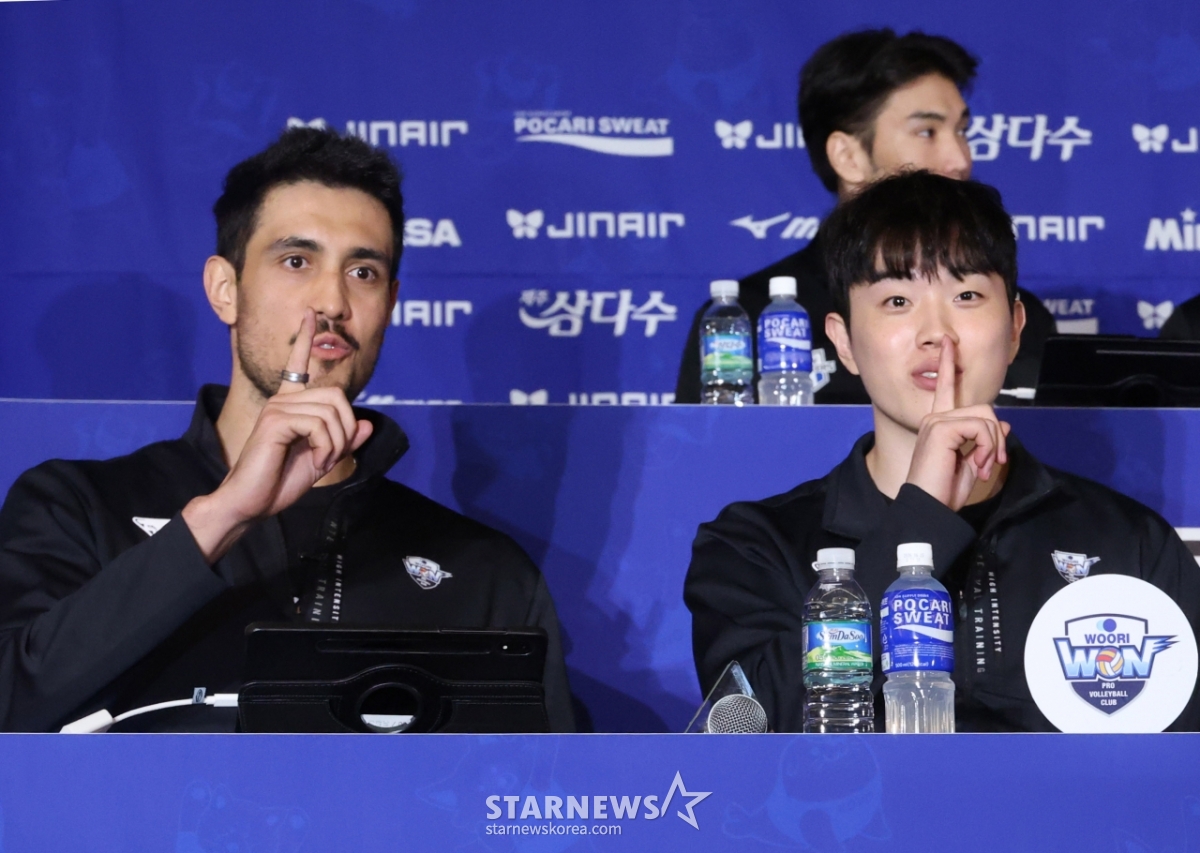스포츠일반[포토] 김지한-하파엘 '쉿! 우승 누구?'발행 : 2025.10.15 ・ 16:12청담동=김진경 대기자진에어 2025-2026시즌 V리그 미디어데이가 15일 서울 강남구 청담 리베라호텔에서 열렸다.우리카드 김지한과 하파엘 아라우죠가 구단 구호를 발표하고 있다.<저작권자 © 스타뉴스, 무단전재 및 재배포 금지>남자배구미데미디어데이V리그진에어신호진추천 기사김진경 대기자기자홈좋아요 스포츠-일반의 인기 급상승 뉴스스포츠-일반의 최신 뉴스