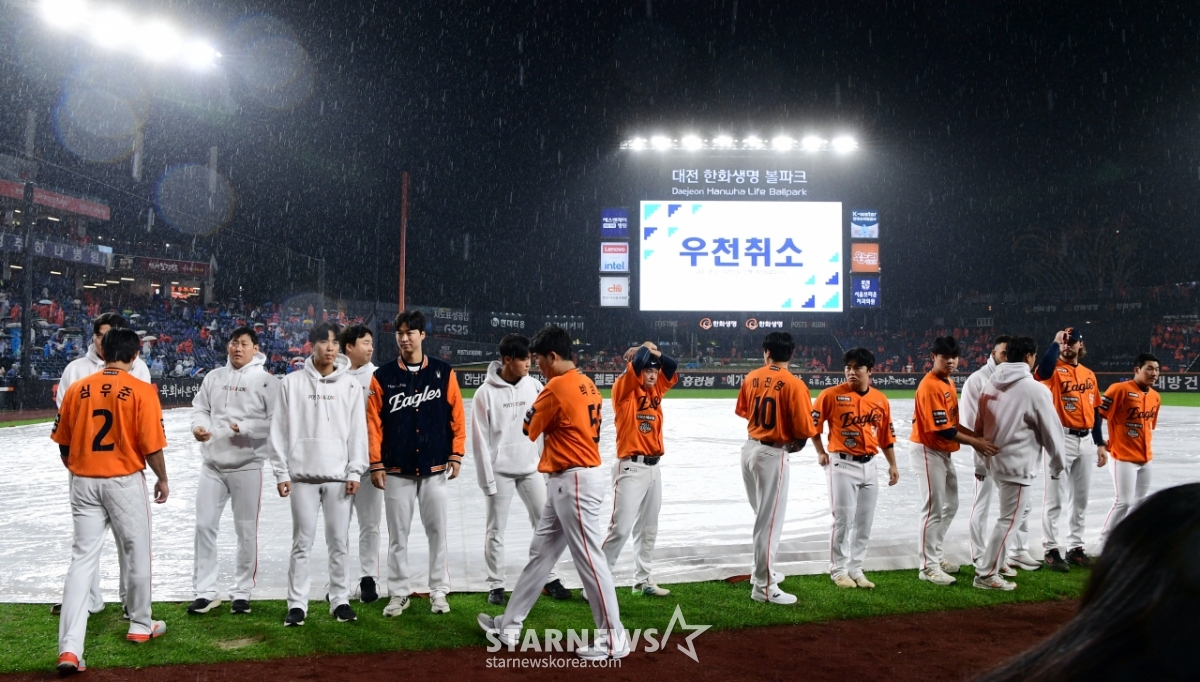 스포츠야구[포토] '플레이오프1차전 가을비에 순연'발행 : 2025.10.17 ・ 18:38대전=강영조 선임기자17일 대전한화생명볼파크에서 열리는 2025 KBO리그 플레이오프 1차전을 앞두고 가을비가 촉촉하게 대지를 적시는가운데 경기개시를 앞두고 폭우가 내리자 취소가 결정됐다. 한화 선수들이 우천취소가 발표되자 그라운드에 나와 인사를 하고 있다. 2025.10.17.<저작권자 © 스타뉴스, 무단전재 및 재배포 금지>브리핑요약 없이도 가볍게 읽으실 수 있는 짧은 뉴스입니다.추천 기사강영조 선임기자기자홈좋아요스포츠-야구의 인기 급상승 뉴스스포츠-야구의 최신 뉴스