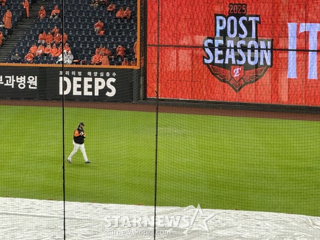 다만 비가 1차전 변수가 됐다. 이날 대전에는 오후 4시를 전후해 조금씩 비가 내리기 시작했다. 처음에는 강우가 시작됐다 바로 멈췄지만, 이후 5시를 넘어 많은 비가 쏟아졌다. 점점 비가 굵어지면서 그라운드에 대형 방수포가 깔렸다.