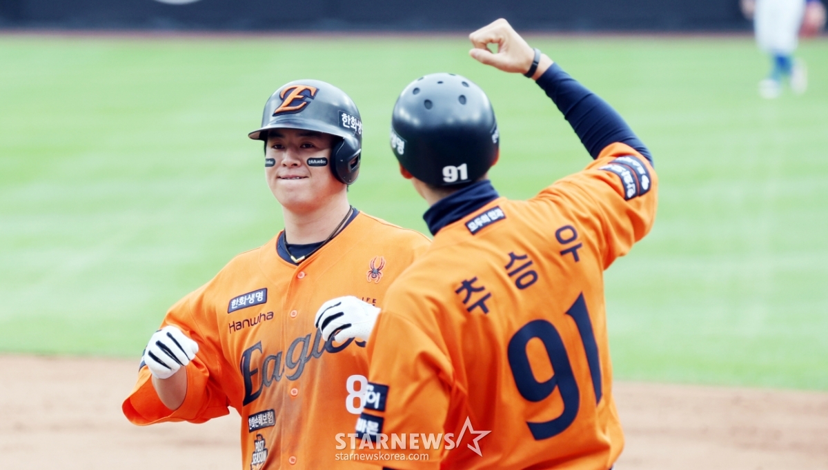 한화 4번타자 노시환이 18일 대전한화생명볼파크에서 열리는 2025 KBO리그 삼성라이온즈와 한화이글스 플레이오프 1차전 2회말 2사 3루에서 1타점 안타로 출루하고 있다. 025.10.18.