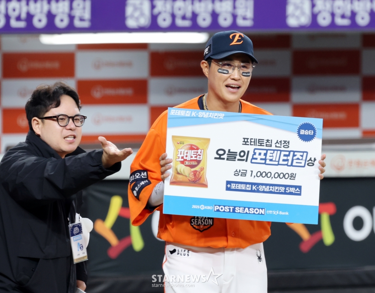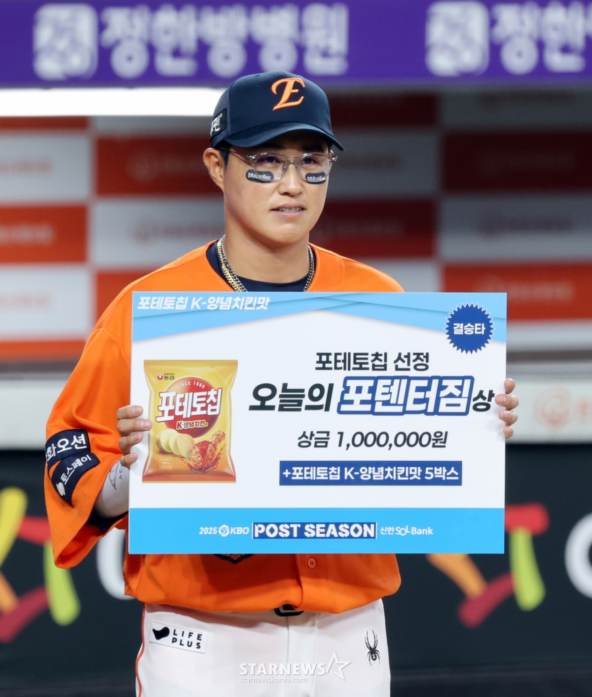 한화 결승타 주인공 채은성이 18일 대전한화생명볼파크에서 열리는 2025 KBO리그 삼성라이온즈와 한화이글스 플레이오프 1차전 '오늘의 포텐터짐상'을 수상하고 있다. 2025.10.18.