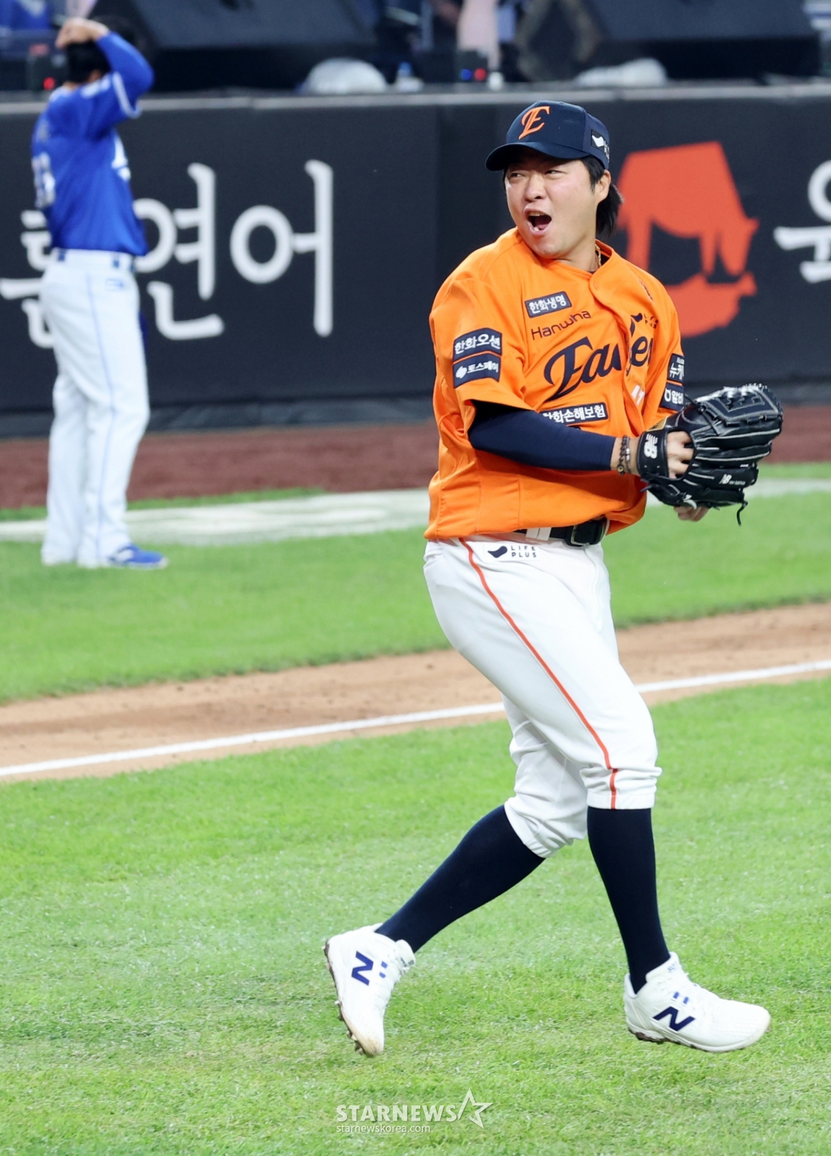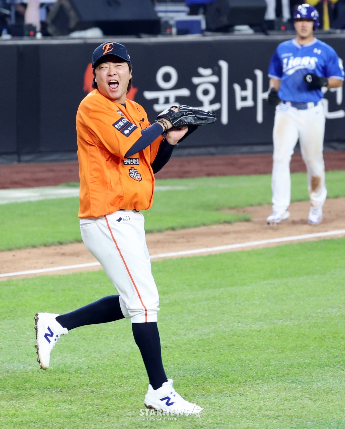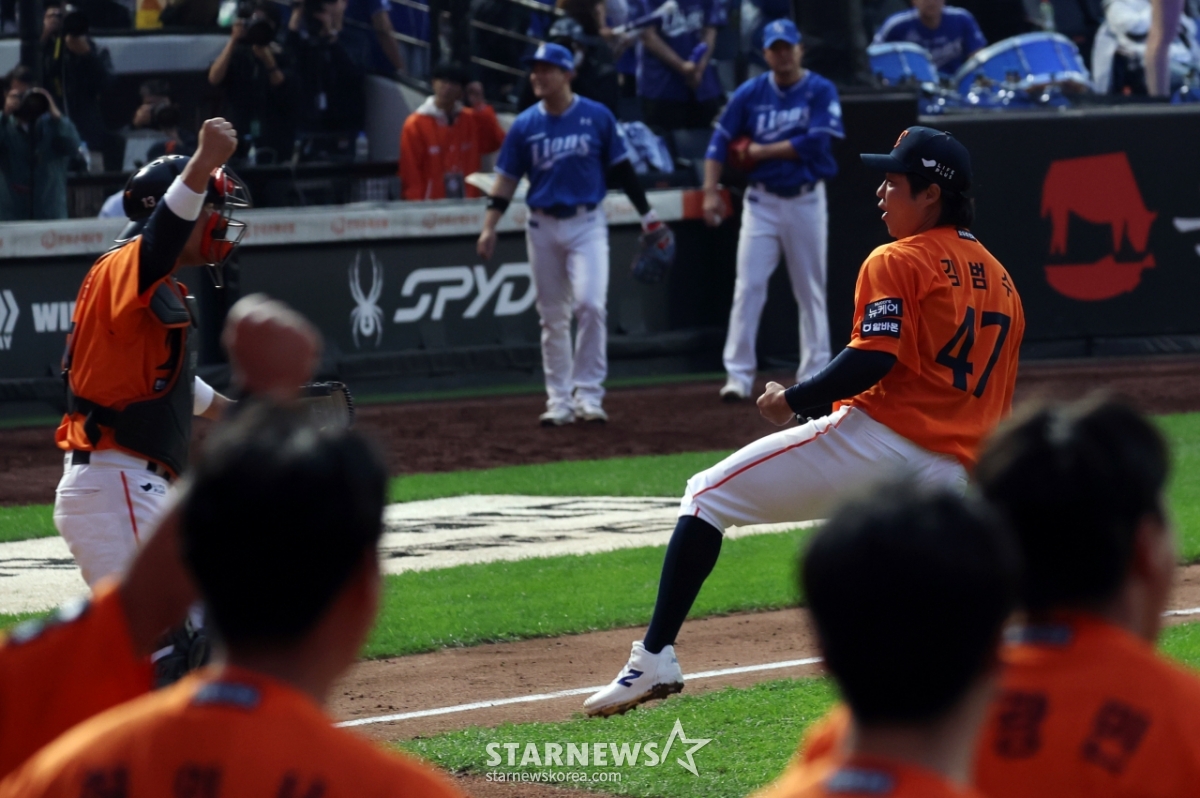 한화 좌완투수 김범수가 18일 대전한화생명볼파크에서 열리는 2025 KBO리그 삼성라이온즈와 한화이글스 플레이오프 1차전 9회초 김서현을 대신해 등판해 1점차 리드를 지켜내며 환호하고 있다. 2025.10.18.