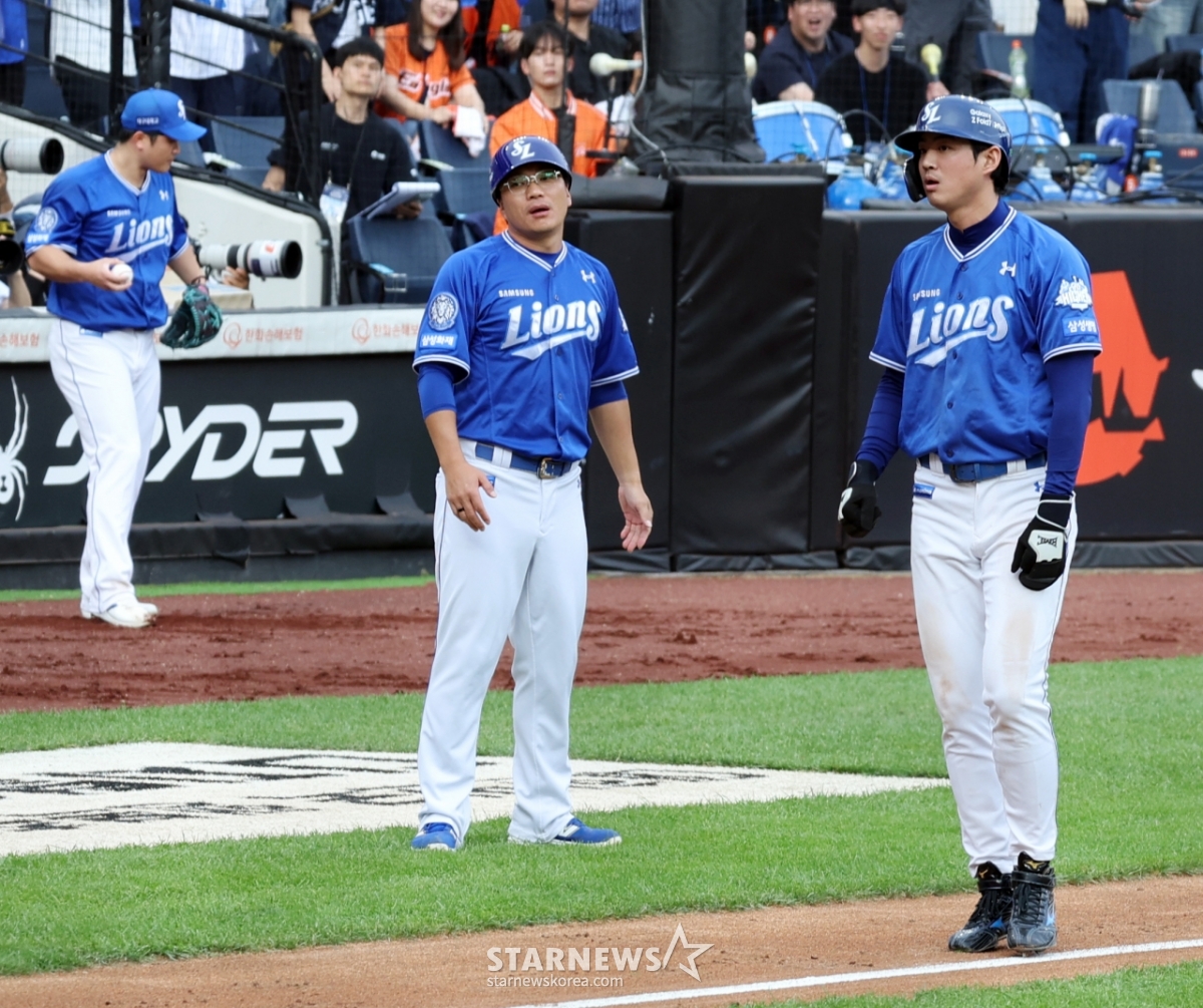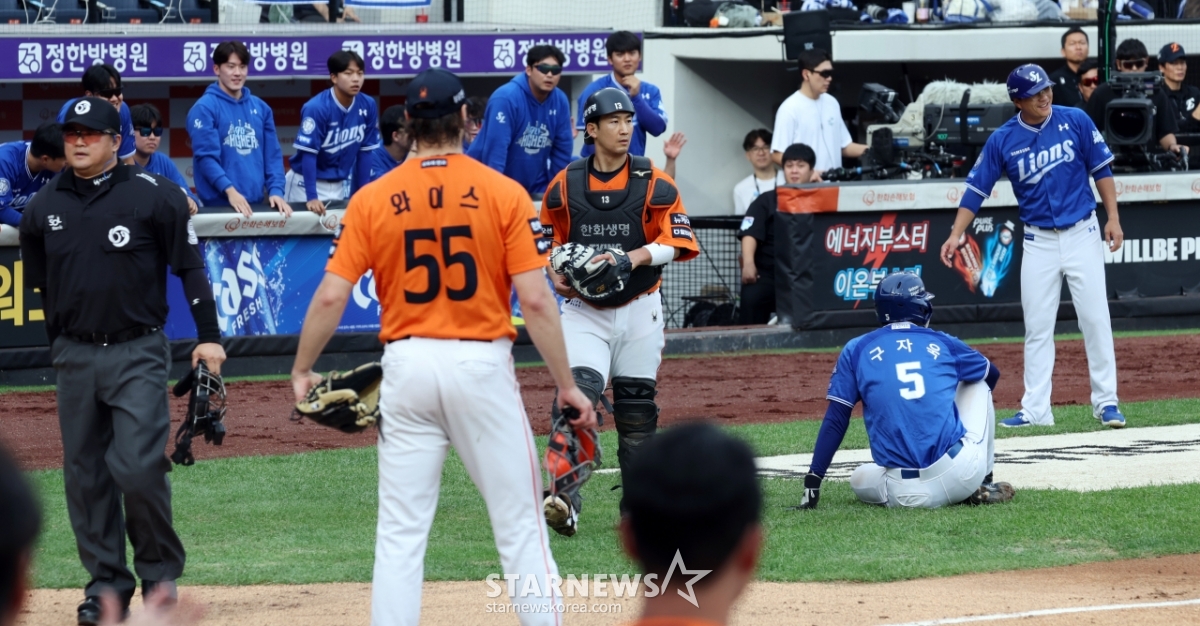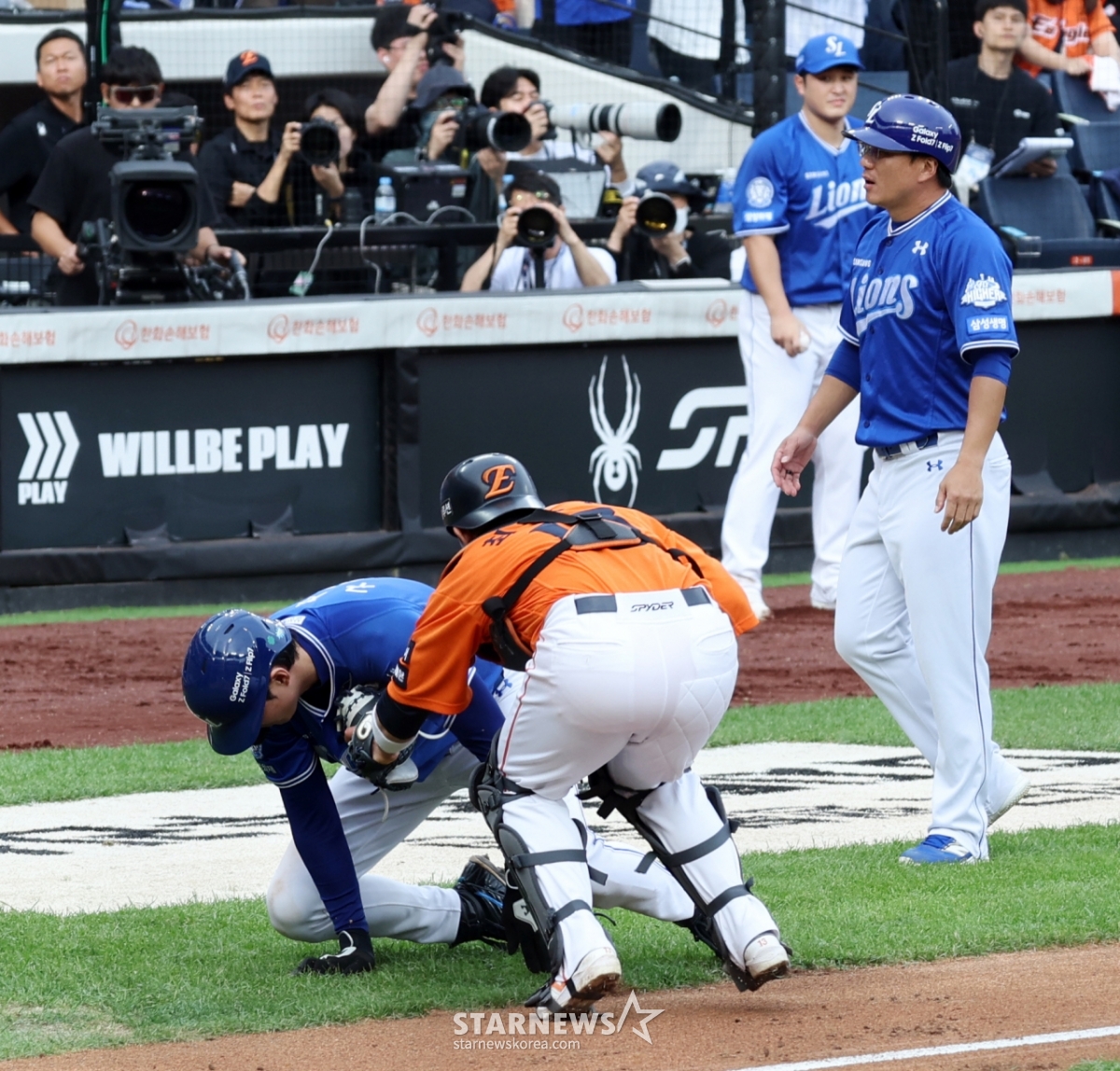 삼성 구자욱이 19일 대전한화생명볼파크에서 열리는 2025 KBO리그 삼성라이온즈와 한화이글스 플레이오프 2차전 4회초 2사 1,3루 디아즈의 2루타때 오버런으로 포수 최재훈에 태그아웃되고 있다. 2025.10.19.