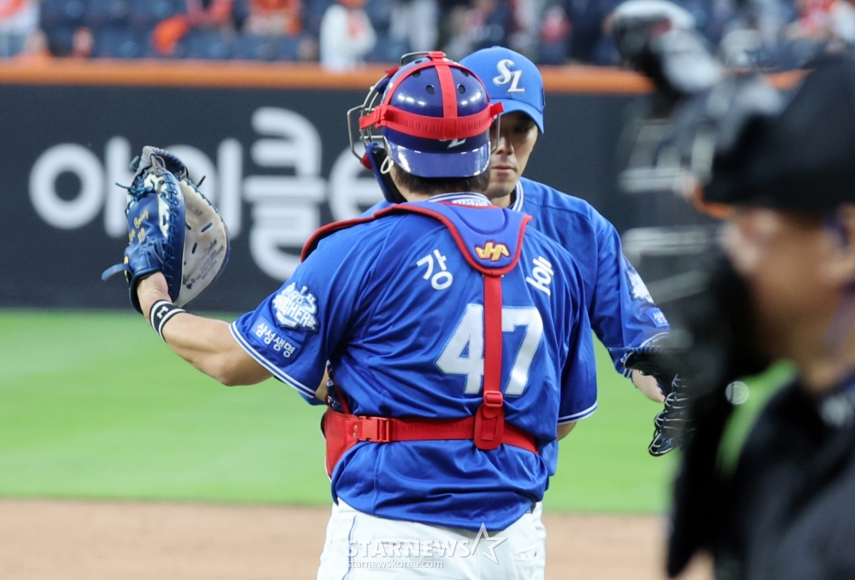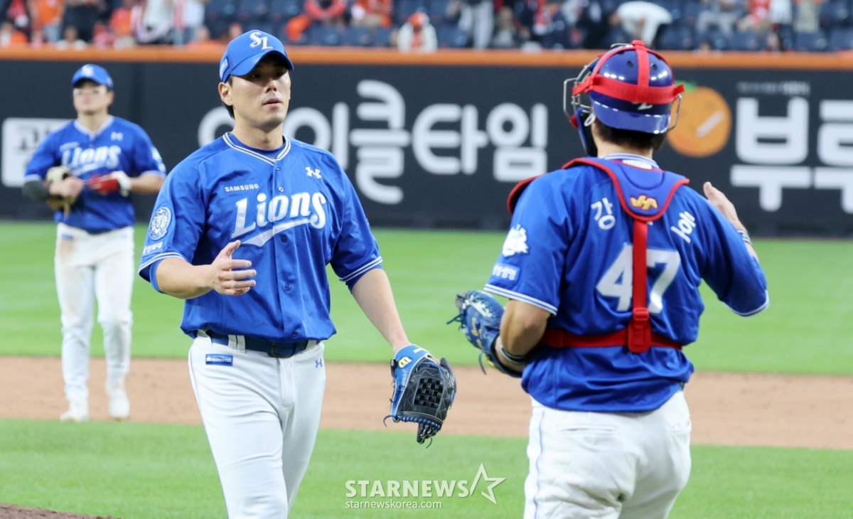 삼성 마무리 김재윤이 19일 대전한화생명볼파크에서 열리는 2025 KBO리그 삼성라이온즈와 한화이글스 플레이오프 2차전에서 승리한후 포수 강민호와 기쁨을 나누고 있다. 2025.10.19.
