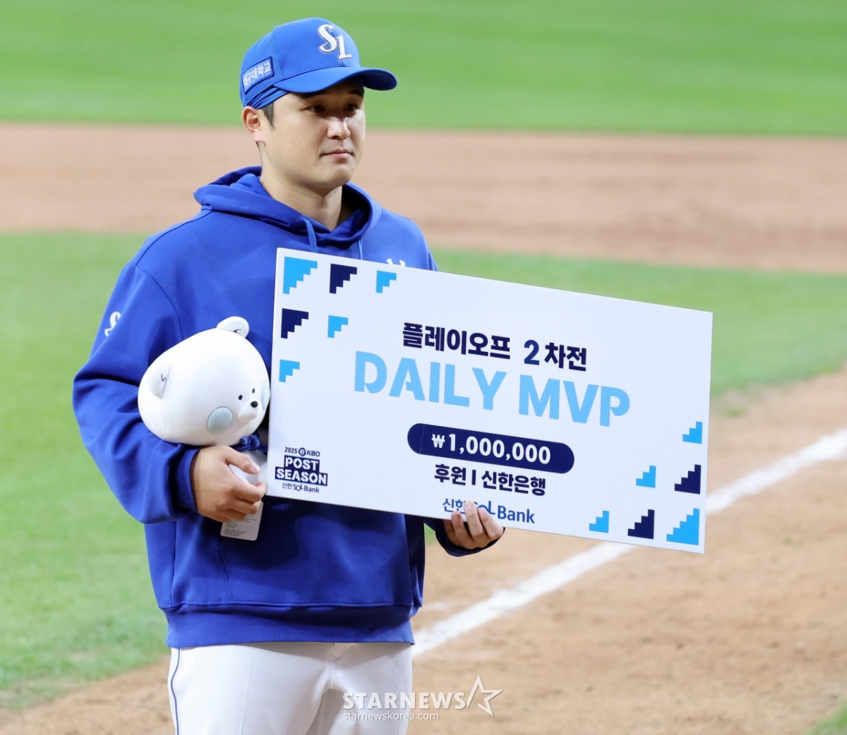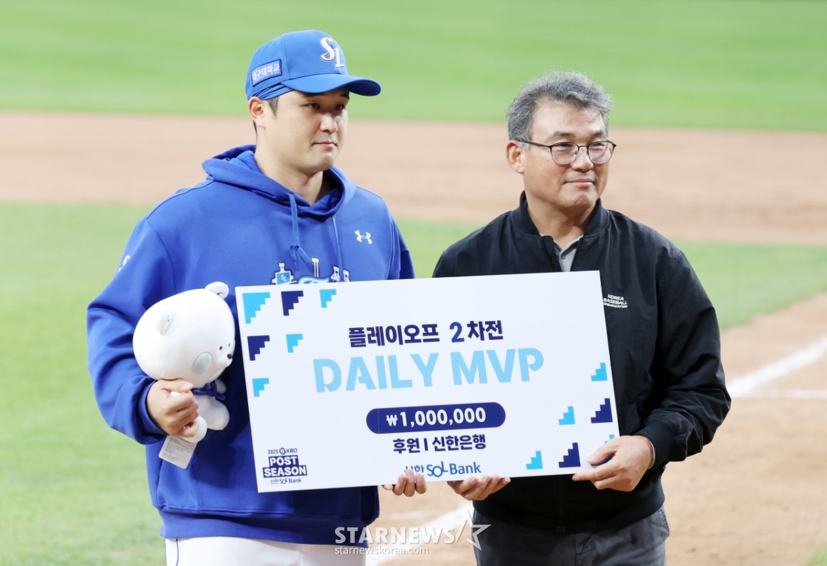 스포츠야구[포토]'플레이오프 데일리MVP' 삼성 승리투수 최원태발행 : 2025.10.19 ・ 17:47대전=강영조 선임기자삼성 승리투수 최원태가 19일 대전한화생명볼파크에서 열리는 2025 KBO리그 삼성라이온즈와 한화이글스 플레이오프 2차전에서 MVP를 수상하고 있다. 2025.10.19.삼성 승리투수 최원태가 19일 대전한화생명볼파크에서 열리는 2025 KBO리그 삼성라이온즈와 한화이글스 플레이오프 2차전에서 박종훈 경기감독관으로부터 MVP를 수상하고 있다. 2025.10.19.<저작권자 © 스타뉴스, 무단전재 및 재배포 금지>삼성최원태데일리MVP대전볼파크추천 기사강영조 선임기자기자홈좋아요 스포츠-야구의 인기 급상승 뉴스스포츠-야구의 최신 뉴스