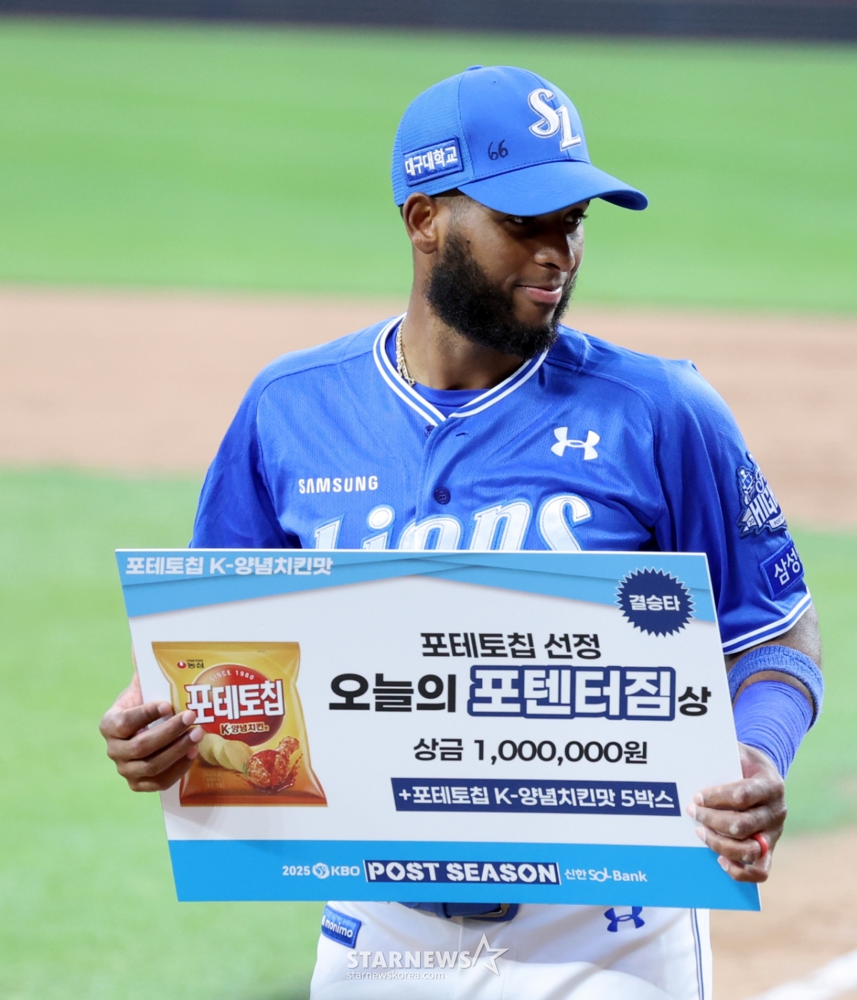 스포츠야구[포토]플레이오프2차전 '포텐터짐상' 디아즈발행 : 2025.10.19 ・ 17:48대전=강영조 선임기자삼성 결승타 주인공 디아즈가 19일 대전한화생명볼파크에서 열리는 2025 KBO리그 삼성라이온즈와 한화이글스 플레이오프 2차전에서 오늘의 포텐터짐상을 수상하고 있다. 2025.10.19.<저작권자 © 스타뉴스, 무단전재 및 재배포 금지>디아즈삼성플레이오프터짐대전볼파크추천 기사강영조 선임기자기자홈좋아요 스포츠-야구의 인기 급상승 뉴스스포츠-야구의 최신 뉴스