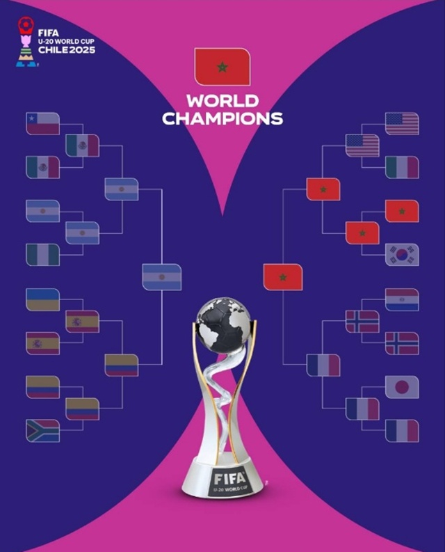 모로코는 20일(한국시간) 칠레 산티아고의 에스타디오 나시오날 훌리오 마르티네스 프라다노에서 열린 2025 국제축구연맹(FIFA) 20세 이하(U-20) 월드컵 결승에서 아르헨티나를 2-0으로 이겼다. 이로써 모로코는 이번 대회 사상 첫 우승은 물론, FIFA 주관 대회에서 처음 정상에 오르는 쾌거를 이뤄냈다.