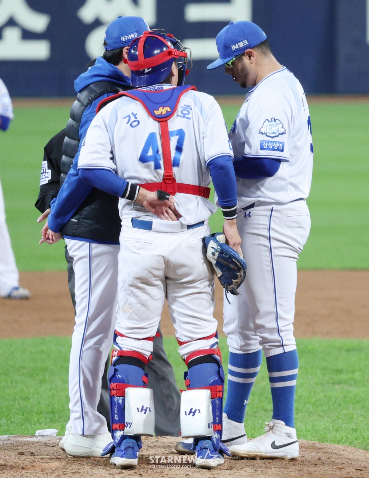 스포츠야구[포토] 후라도 '더 이상 흔들리지 않으리'발행 : 2025.10.21 ・ 19:40대구=김진경 대기자2025 KBO리그 플레이오프 3차전 삼성 라이온즈 한화 이글스전이 21일 대구 삼성라이온즈파크에서 열렸다.삼성 선발 후라도가 4회 흔들리자 투수 코치가 올라가 진정시키고 있다.<저작권자 © 스타뉴스, 무단전재 및 재배포 금지>프로야구KBOPO플레이오프포스트시즌류현진추천 기사김진경 대기자기자홈좋아요 스포츠-야구의 인기 급상승 뉴스스포츠-야구의 최신 뉴스