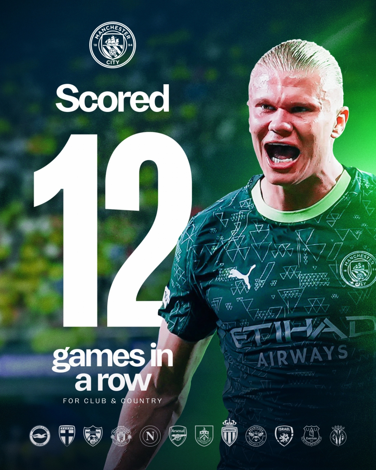 홀란은 역대급 득점 페이스를 이어갔다. 맨시티와 노르웨이 국가대표팀 14경기에서 무려 24골을 작렬했다.