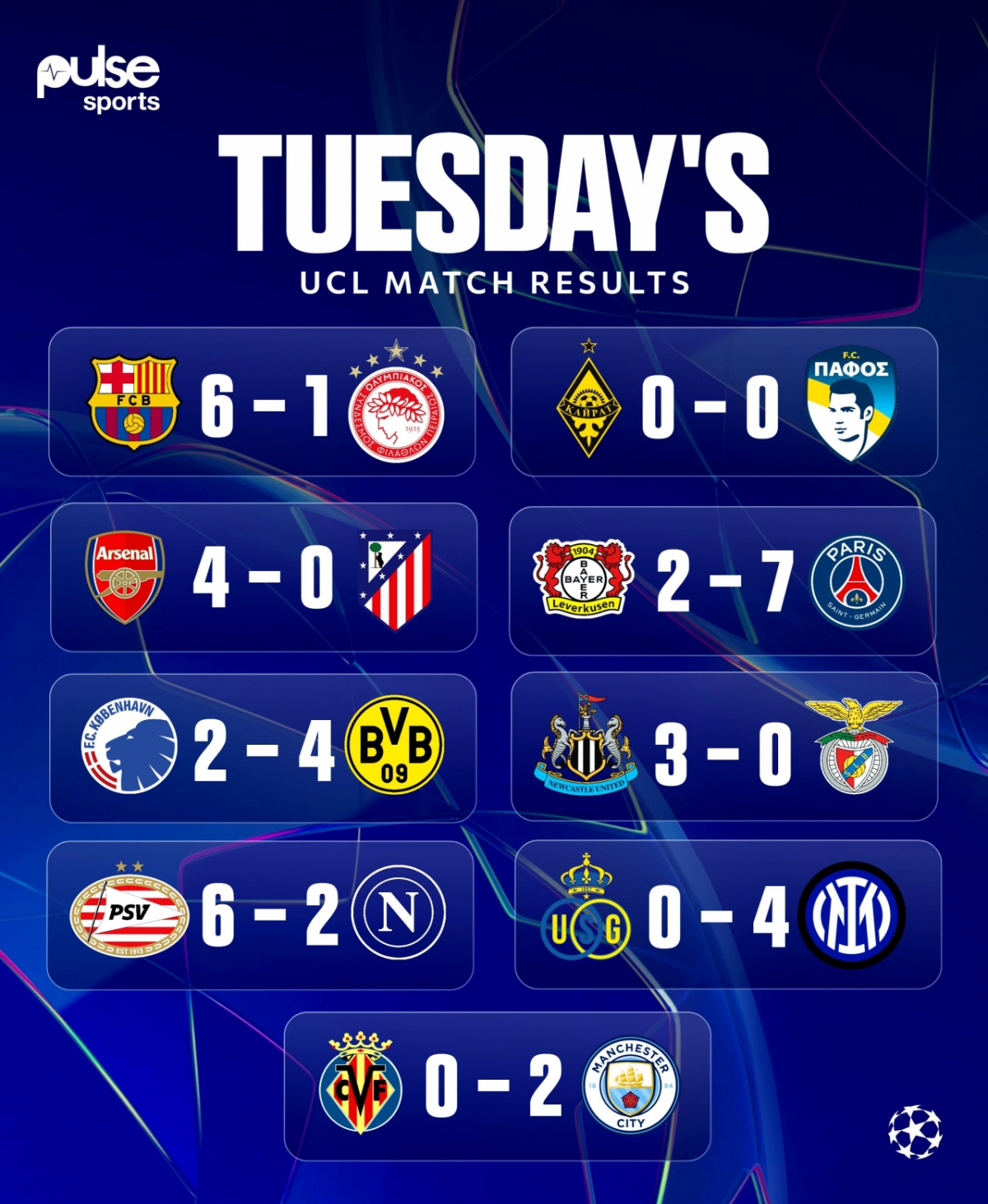 이밖에 FC바르셀로나는 페르민 로페스의 해트트릭과 마커스 래시포드의 멀티골, 라민 야말의 추가골을 더해 올림피아코스를 홈에서 6-1로 대파했다. 보루시아 도르트문트는 코펜하겐 원정에서 4-2로, 인터밀란과 아스날은 각각 위니옹 생질루아즈, 아틀레티코 마드리드를 4-0으로 제압했다.