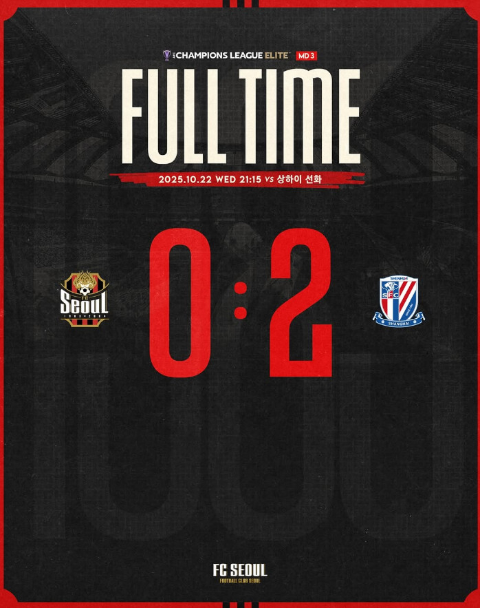 서울은 지난 22일(한국시간) 중국 상하이 스타디움에서 열린 상하이 선화와 '2025~2026 아시아축구연맹(AFC) 챔피언스리그 엘리트(ACLE)' 리그 페이즈 3차전 원정에서 0-2로 완패했다.