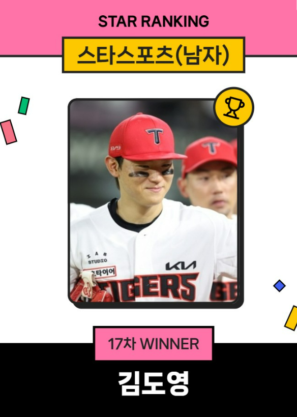 김도영은 지난 10월 16일 오후 3시 1분부터 10월 23일 오후 3시까지 집계한 스타랭킹 스타스포츠 남자 17차 투표에서 1만 3943표를 획득해 1위를 굳게 지켰다. 2위는 11047표를 받은 남자프로농구 스타 허웅(32·부산 KCC)이다.