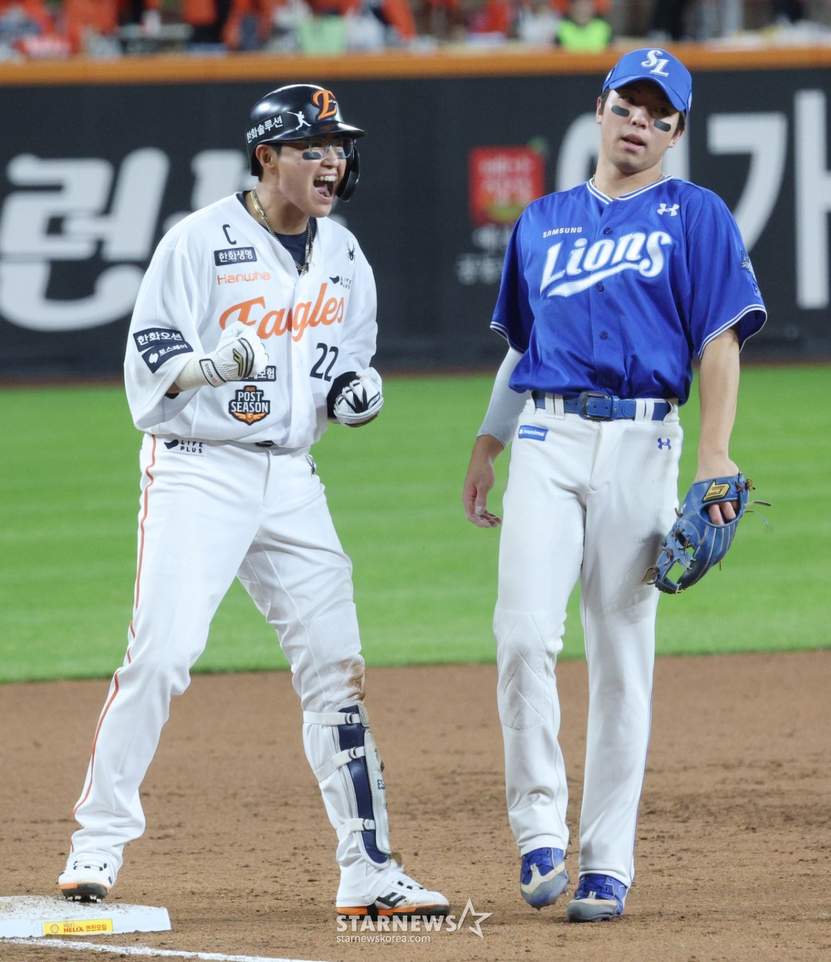 스포츠야구[포토] 채은성 '김영웅 앞에서 사자후'발행 : 2025.10.24 ・ 20:18대전=김진경 대기자2025 KBO리그 플레이오프 5차전 한화 이글스 대 삼성 라이온즈전이 24일 대전 한화생명 볼파크에서 열렸다.한화 채은성이 3회말 1사 1,3루에서 1타점 우월 2루타를 날리고 2루에서 세이프되고 있다. 상대 실책에 3루까지 뛰어 출루한 후 포효하고 있다.<저작권자 © 스타뉴스, 무단전재 및 재배포 금지>프로야구KBO플레이오프5차전폰세최원태추천 기사김진경 대기자기자홈좋아요 스포츠-야구의 인기 급상승 뉴스스포츠-야구의 최신 뉴스
