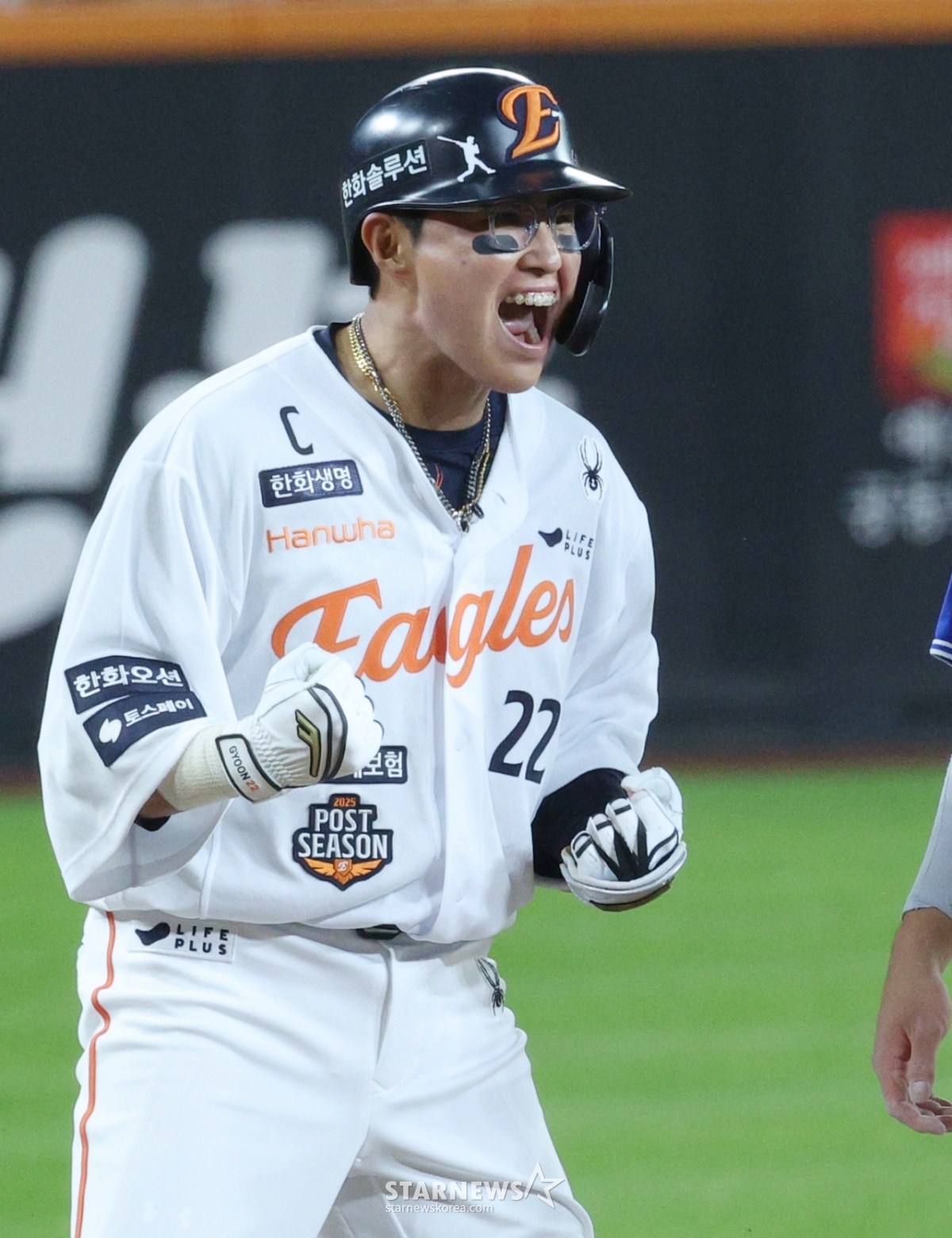 스포츠야구[포토] 채은성 '이쯤 되면 쐐기타'발행 : 2025.10.24 ・ 20:19대전=김진경 대기자2025 KBO리그 플레이오프 5차전 한화 이글스 대 삼성 라이온즈전이 24일 대전 한화생명 볼파크에서 열렸다.한화 채은성이 3회말 1사 1,3루에서 1타점 우월 2루타를 날리고 2루에서 세이프되고 있다. 상대 실책에 3루까지 뛰어 출루한 후 포효하고 있다.<저작권자 © 스타뉴스, 무단전재 및 재배포 금지>프로야구KBO플레이오프5차전폰세최원태추천 기사김진경 대기자기자홈좋아요 스포츠-야구의 인기 급상승 뉴스스포츠-야구의 최신 뉴스