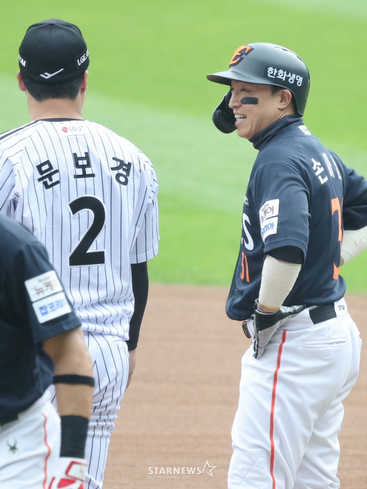 스포츠야구[포토] 손아섭-문보경 '미소 뒤 숨은 병기는?'발행 : 2025.10.26 ・ 14:46잠실=김진경 대기자2025 KBO리그 한국시리즈 1차전 LG 트윈스 대 한화 이글스전이 26일 잠실야구장에서 열렸다.한화 손아섭이 1회초 무사에서 우전안타로 출루한 후 LG 1루수 문보경과 대화하고 있다.<저작권자 © 스타뉴스, 무단전재 및 재배포 금지>프로야구KBO폰세김경문_감독노시환하주석추천 기사김진경 대기자기자홈좋아요 스포츠-야구의 인기 급상승 뉴스스포츠-야구의 최신 뉴스