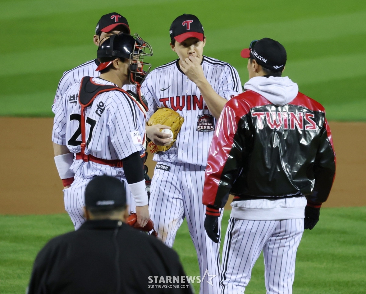 스포츠야구[포토] 임찬규 '더 이상 흔들리지 않으리'발행 : 2025.10.27 ・ 18:52잠실=김진경 대기자2025 KBO리그 한국시리즈 2차전 LG 트윈스 대 한화 이글스전이 27일 잠실야구장에서 열렸다.LG 선발 임찬규가 1회초 흔들리는 모습을 보이자 김광삼 코치가 마운드로 진정시키고 있다.<저작권자 © 스타뉴스, 무단전재 및 재배포 금지>프로야구KBO폰세김경문_감독노시환하주석추천 기사김진경 대기자기자홈좋아요 스포츠-야구의 인기 급상승 뉴스스포츠-야구의 최신 뉴스