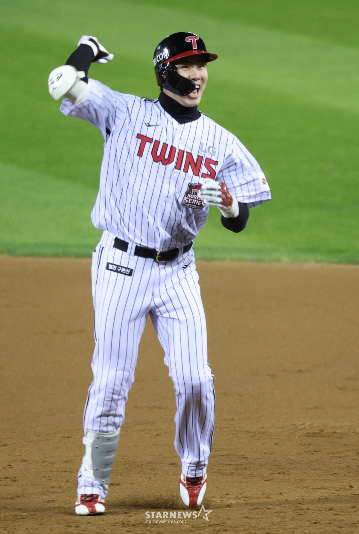 스포츠야구[포토] 홍창기 '역전타 짜릿'발행 : 2025.10.27 ・ 19:40잠실=김진경 대기자2025 KBO리그 한국시리즈 2차전 LG 트윈스 대 한화 이글스전이 27일 잠실야구장에서 열렸다.LG 홍창기가 2회말 1사 2루에서 역전 1타점 적시타를 날리고 출루한 후 환호하고 있다.<저작권자 © 스타뉴스, 무단전재 및 재배포 금지>프로야구KBO폰세김경문_감독노시환하주석추천 기사김진경 대기자기자홈좋아요 스포츠-야구의 인기 급상승 뉴스스포츠-야구의 최신 뉴스