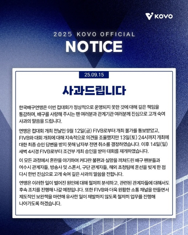연맹은 "커다란 불편과 실망을 끼쳐드린 배구 팬분들과 여수시 관계자들, 방송사 및 스폰서, 구단 관계자들, 해외 초청팀에 혼선을 빚게 한 점 다시 한 번 진심으로 고개 숙여 깊은 사과의 말씀을 전한다"고 전했다.