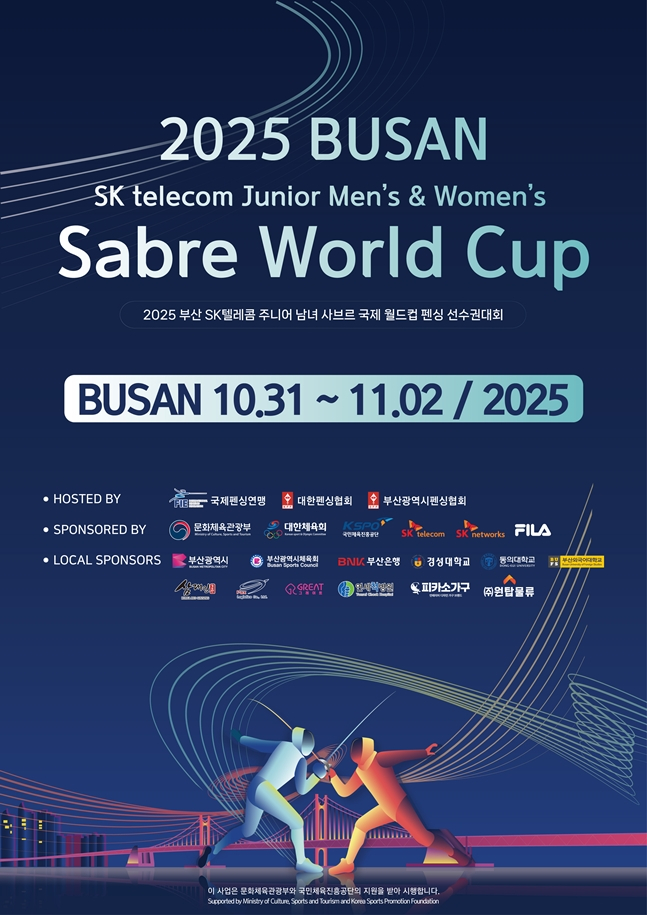 대한펜싱협회(이하 협회)가 오는 10월 31일부터 11월 2일까지 부산 경성대학교 체육관에서'부산 SK텔레콤 주니어 남·녀 사브르 월드컵 대회'를 개최한다고 29일 밝혔다.