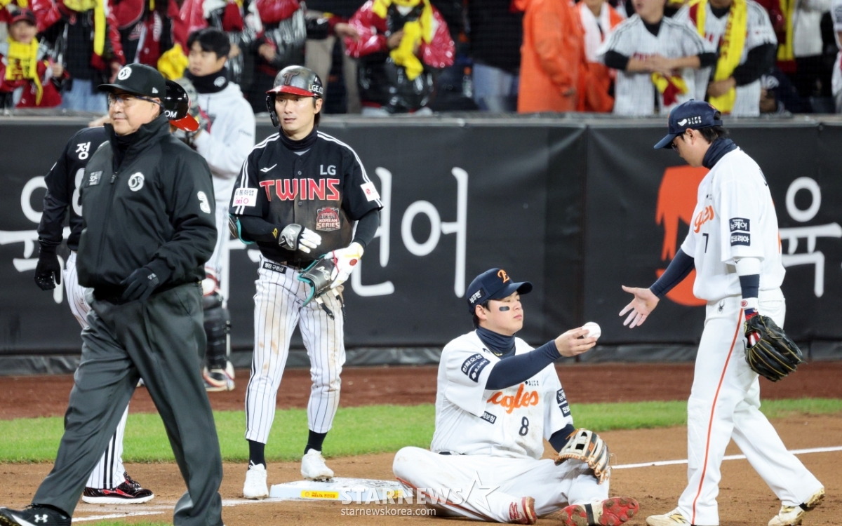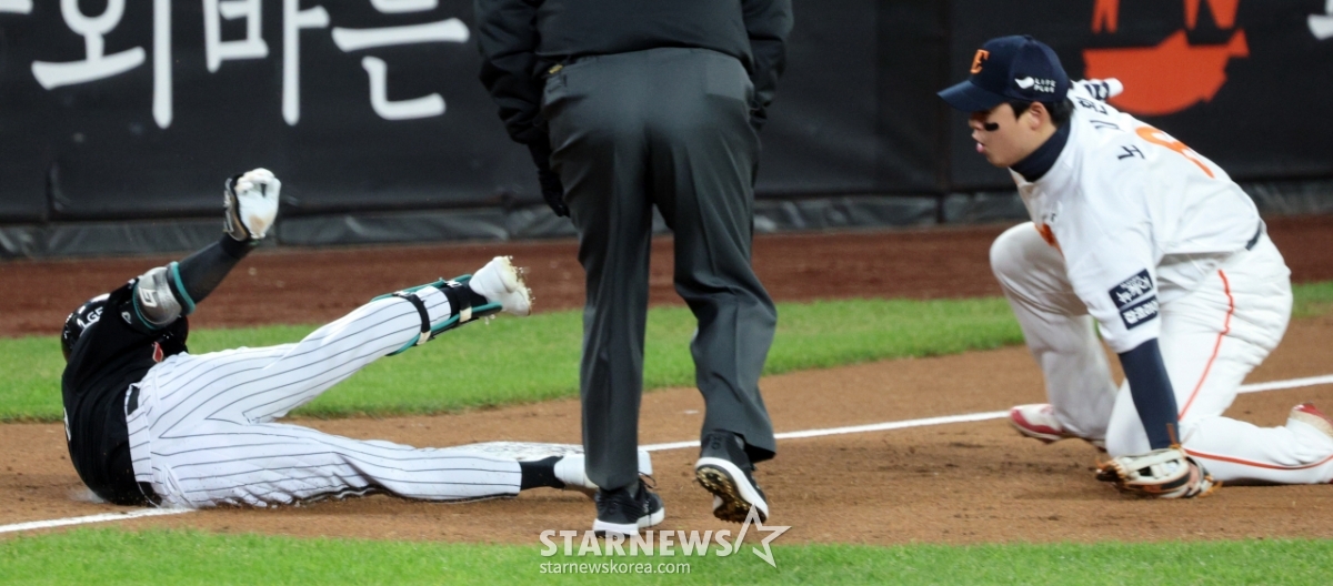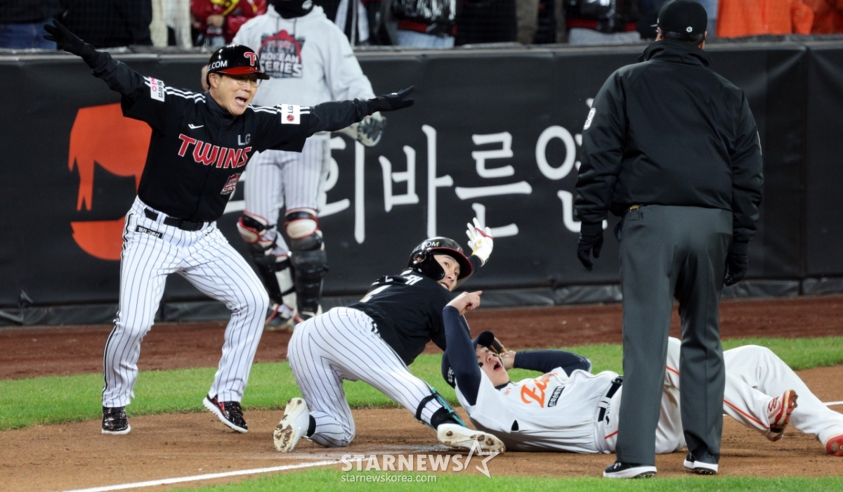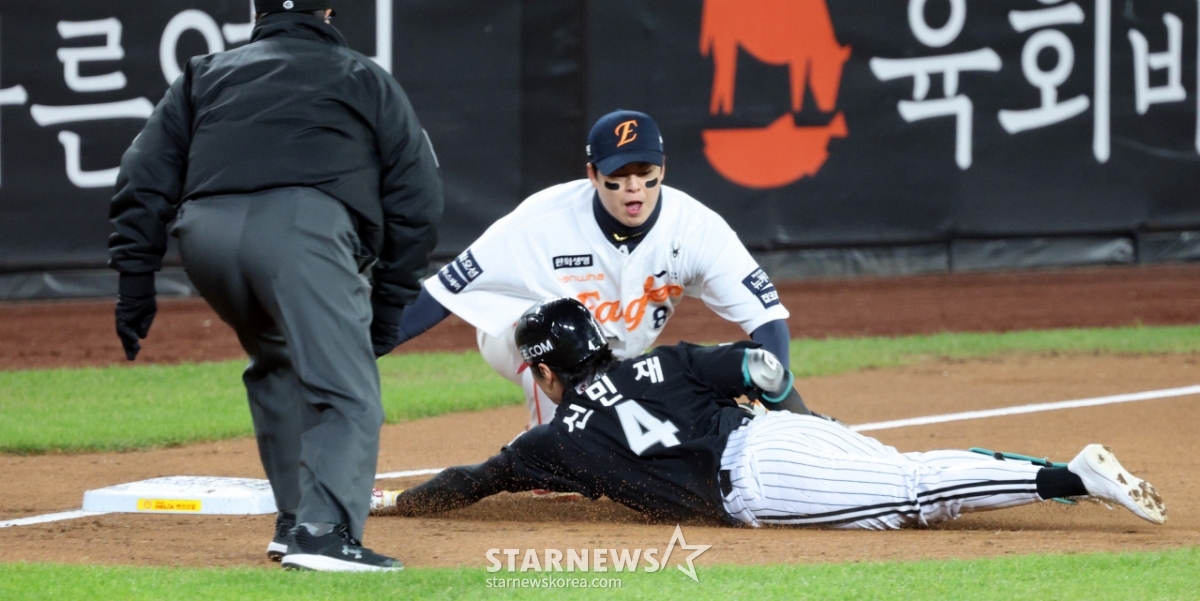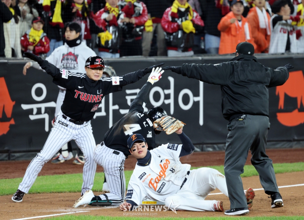 LG 신민재가 29일 대전한화생명볼파크에서 열린 2025KBO리그 한화이글스와 LG트윈스의 한국시리즈3차전 3회초 2사 1루에서 1타점 2루타를 치고 3루까지 내달렸으나 태그아웃되고 있다. 원심은 세이프였으나 한화의 비디오판독 요청으로 번복됐다. 3루수는 노시환. 2025.10.29.