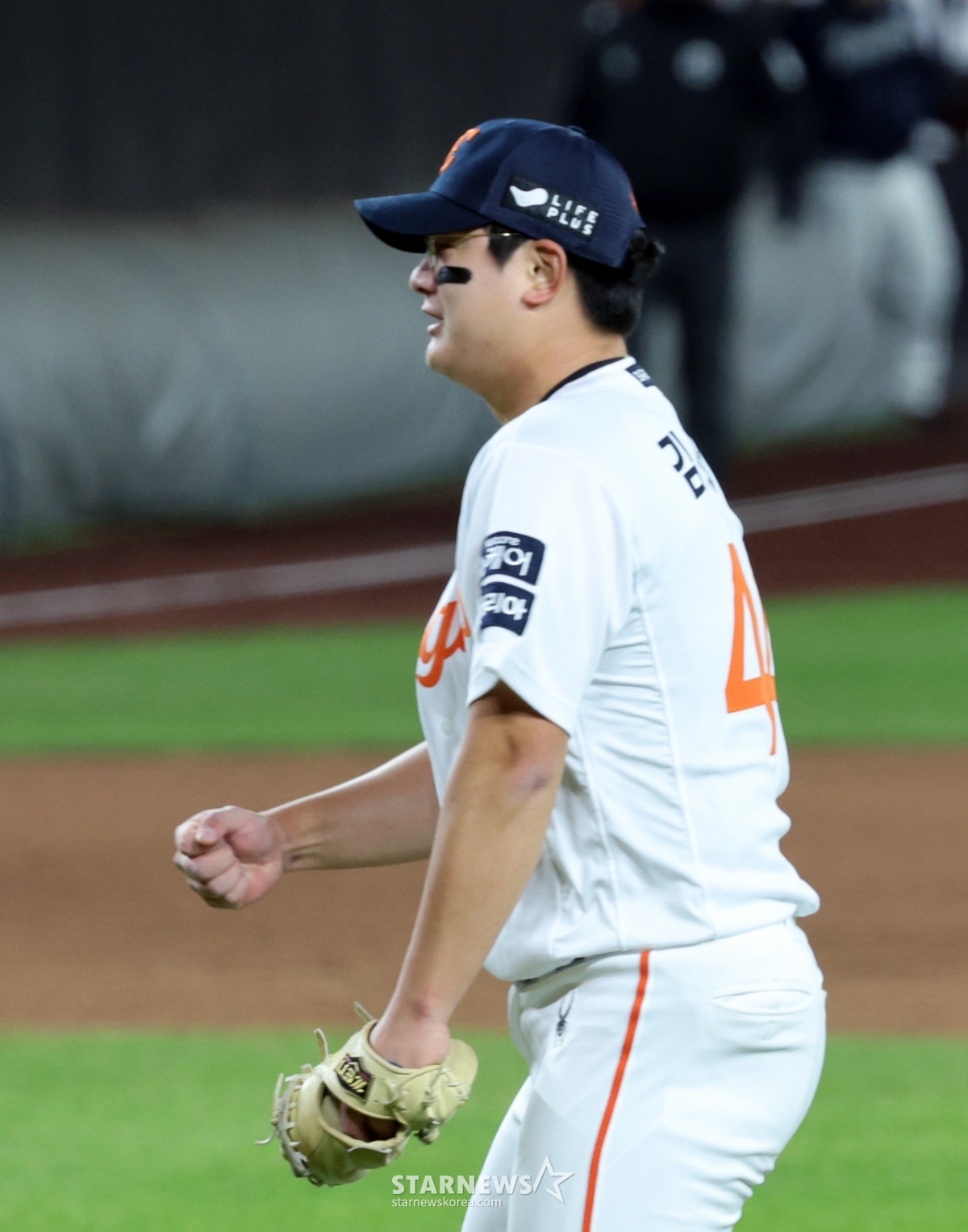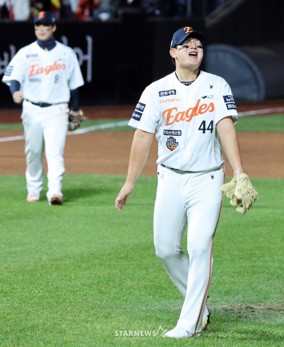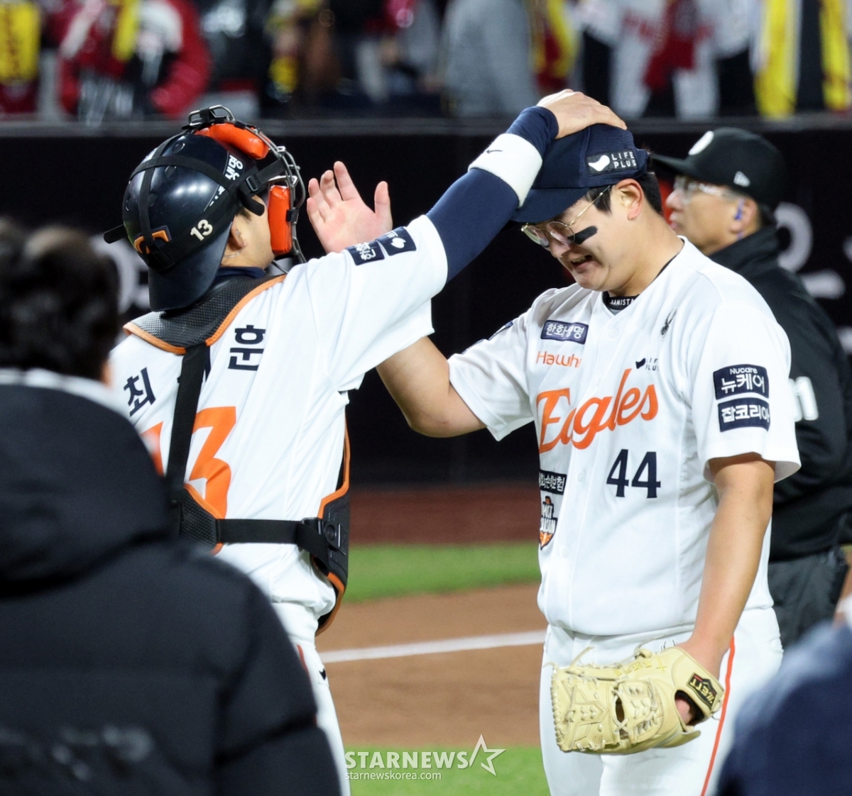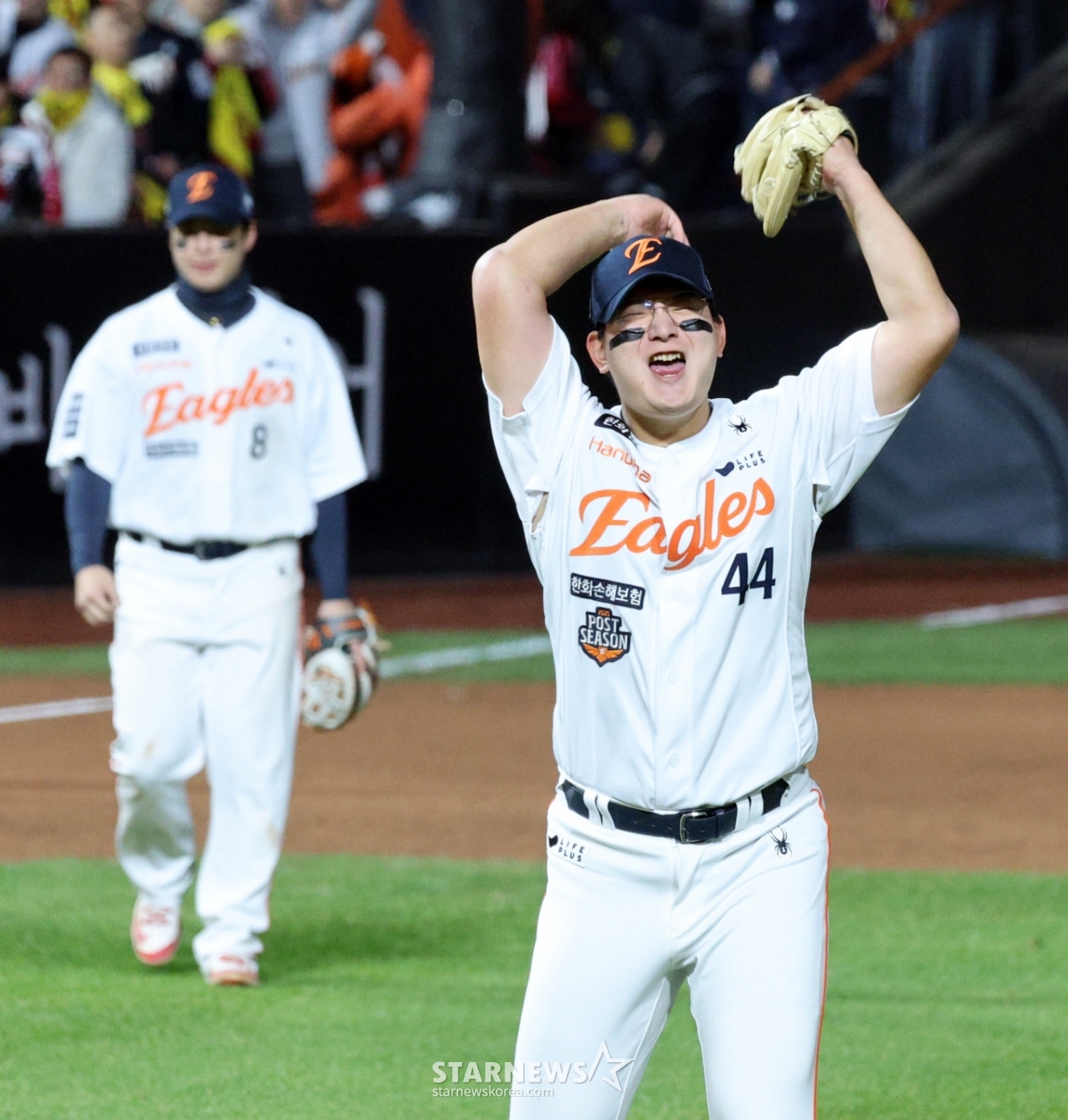 한화 마무리 김서현이 29일 대전한화생명볼파크에서 열린 2025KBO리그 한화이글스와 LG트윈스의 한국시리즈3차전 9회초 1사 1,2루에서 문성주를 병살타로 처리하며 승리를 지켜낸 후 눈물짓고 있다. 2025.10.29.