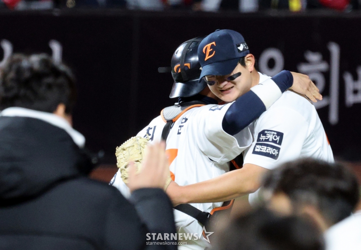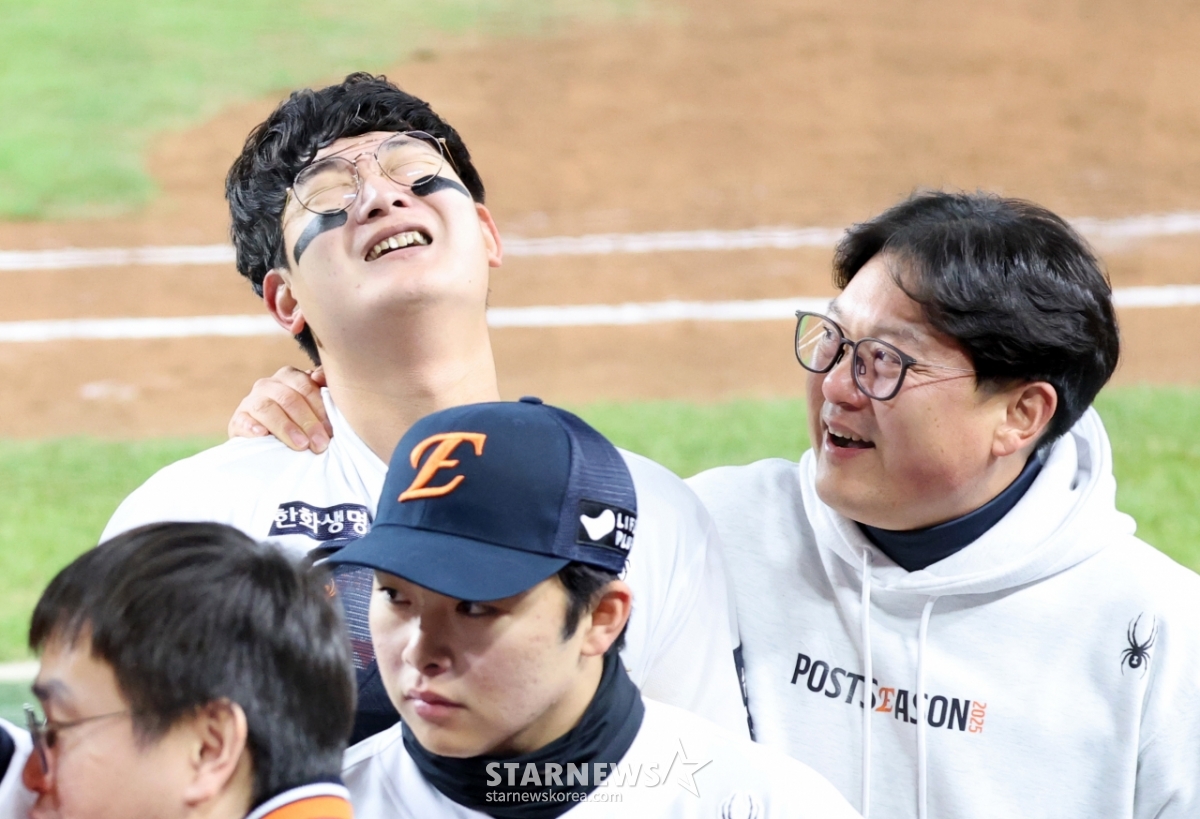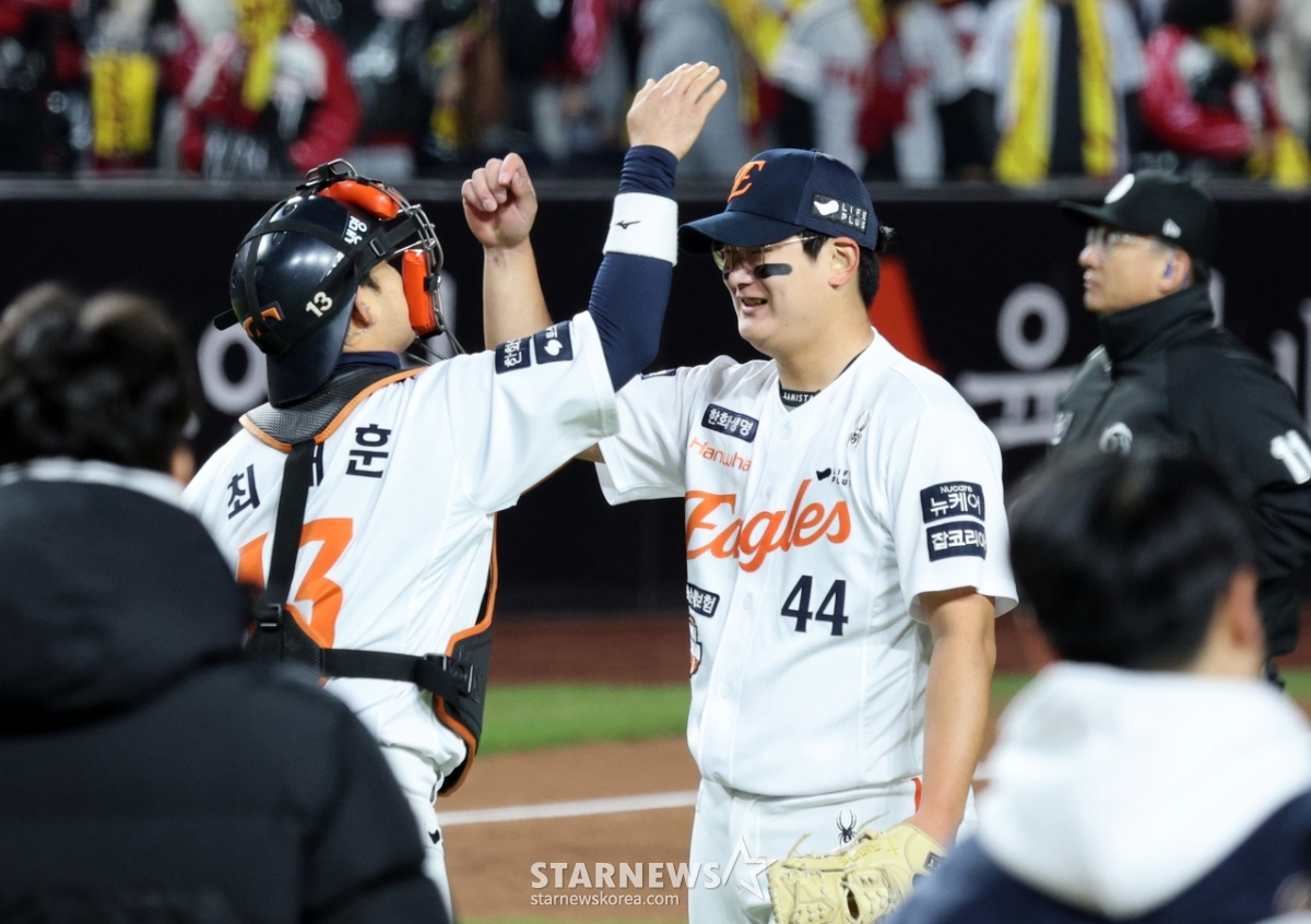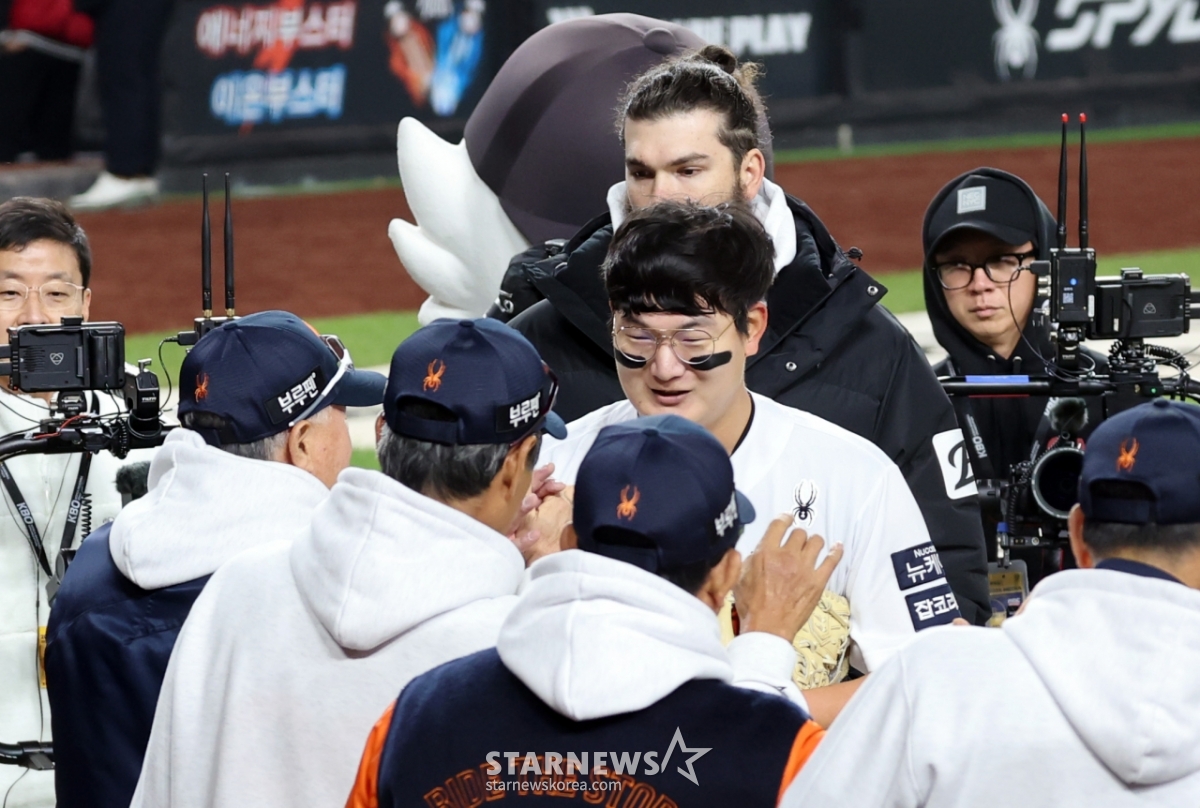 한화 마무리 김서현이 29일 대전한화생명볼파크에서 열린 2025KBO리그 한화이글스와 LG트윈스의 한국시리즈3차전 9회초 1사 1,2루에서 문성주를 병살타로 처리하며 승리를 지켜낸 후 눈물짓고 있다. 2025.10.29.